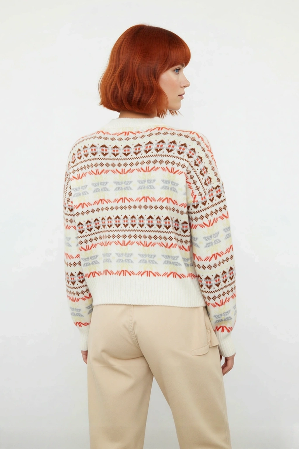 Bu kadınlara özel etnik desenli triko kazak, soğuk hava koşullarında dahi sıcaklık ve stil arayanlar için mükemmel bir seçenektir. Oversize kalıbı sayesinde rahatlık ön planda tutulurken, trendlere uygun ve modern bir duruş sergiler. Göz alıcı etnik desenleri, kazağa benzersiz bir karakter katarken, kahverengi tonlarıyla doğal ve sıcak bir görünüm oluşturur. Orta kalınlıktaki triko kumaşı, vücudunuzu nazikçe sarar ve "Cool & Comfort" hissini gün boyu yaşamanızı sağlar. Bu kazak, casual ve günlük kullanım için ideal olup, kış sezonunun en şık ve konforlu parçalarından biri olmaya adaydır.