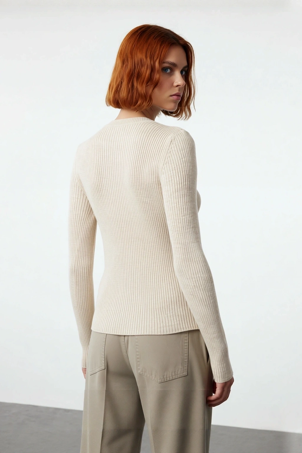 Ürün Özellikleri: Fitted kalıp, %100 akrilik materyal, fitilli desen, bisiklet yaka, standart uzun kol, triko kumaş, bej renk.