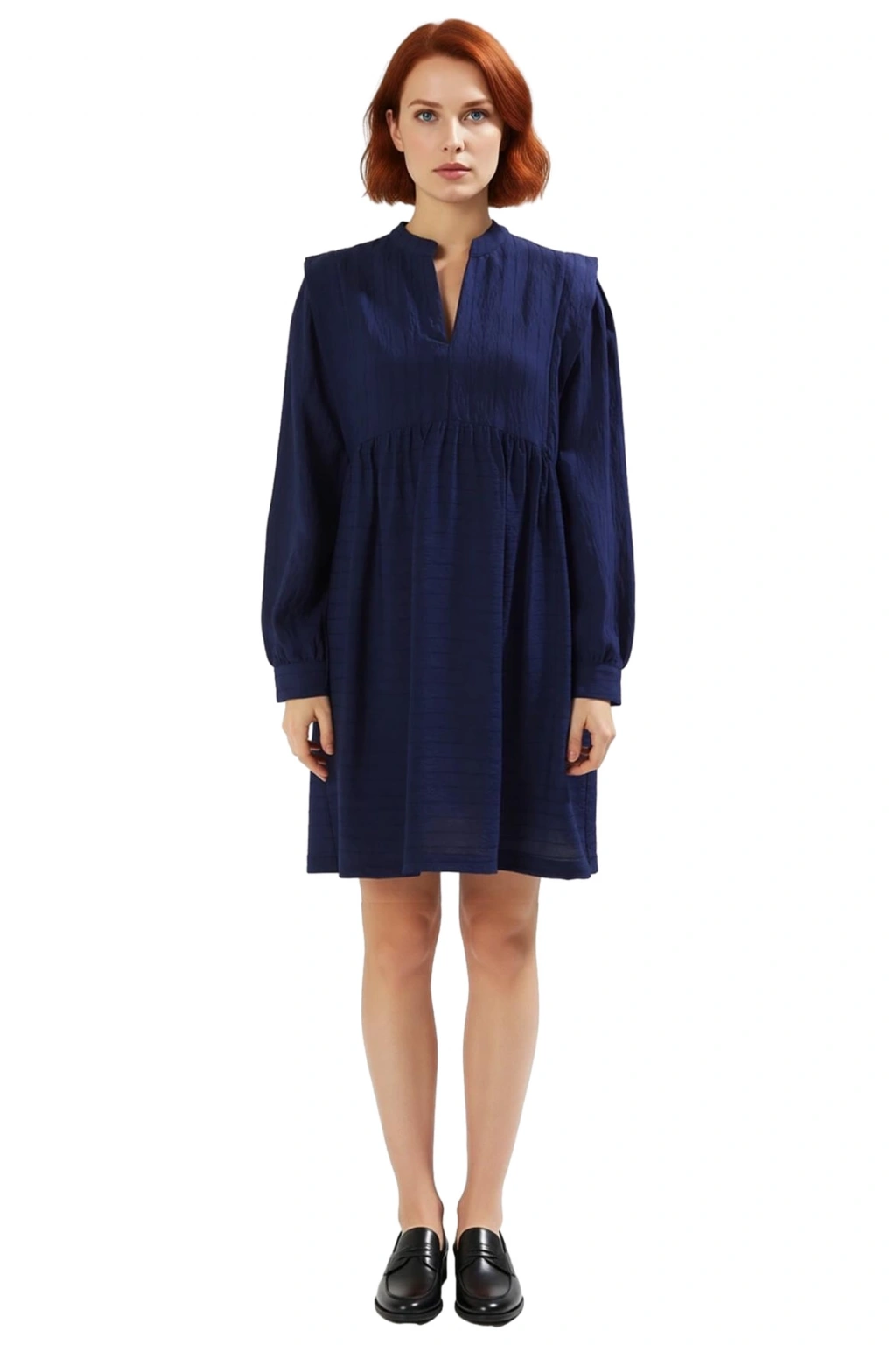 Ürün Özellikleri: Shift kalıp, viskoz poliamid materyal, düz desen, hakim yaka, uzun balon kol, dokuma kumaş, lacivert renk.