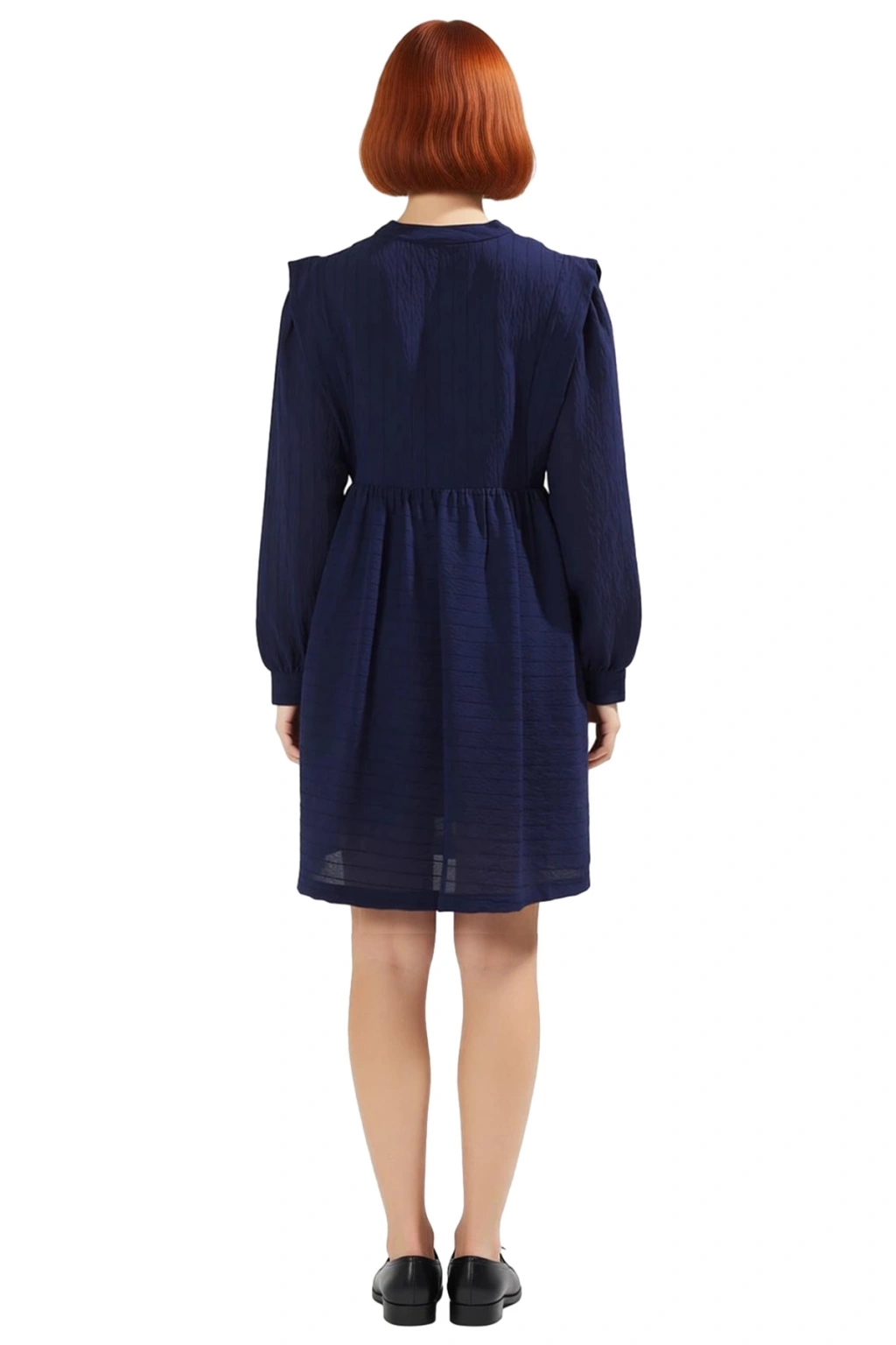 Ürün Özellikleri: Shift kalıp, viskoz poliamid materyal, düz desen, hakim yaka, uzun balon kol, dokuma kumaş, lacivert renk.