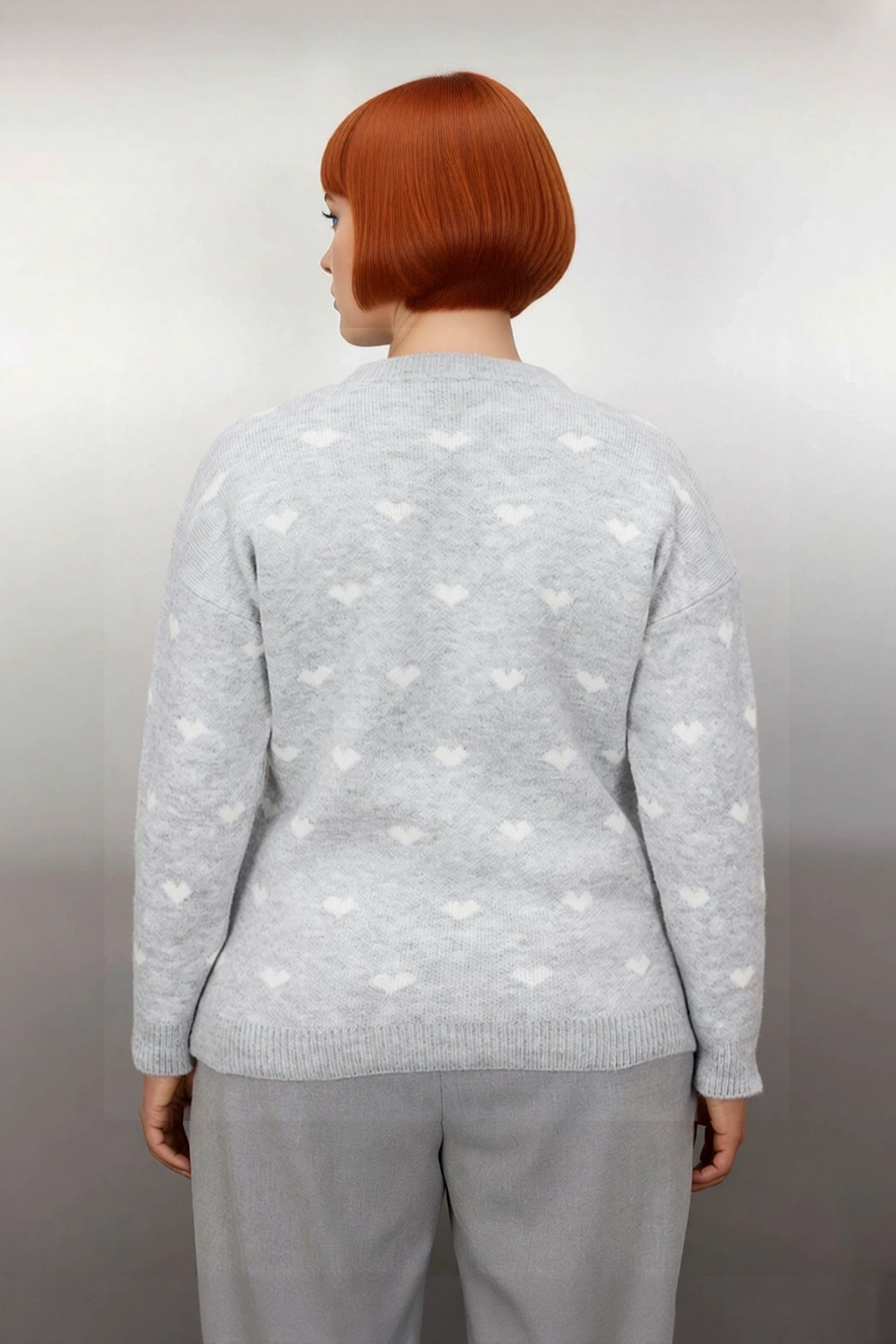 Ürün Özellikleri: Regular kalıp, akrilik polyester materyal, kalp desen, bisiklet yaka, reglan kol, triko kumaş, gri renk.