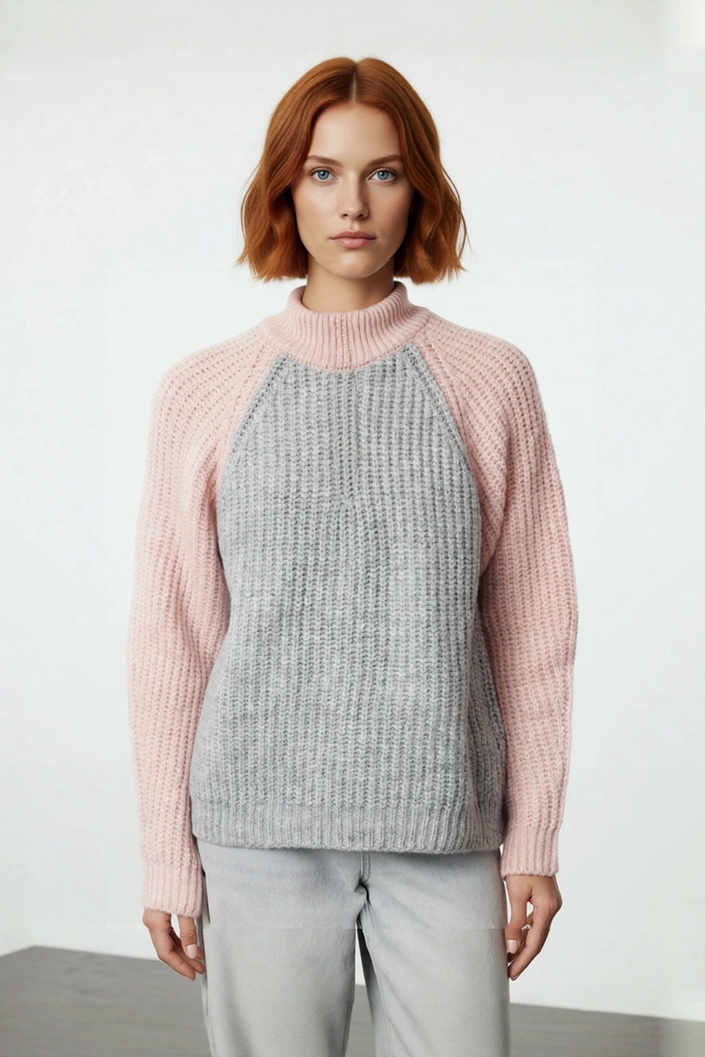 Ürün Özellikleri: Oversize kalıp, akrilik polyester materyal, renk bloklu desen, dik yaka, reglan kol, triko kumaş, pembe gri renk, baskısız tasarım.
