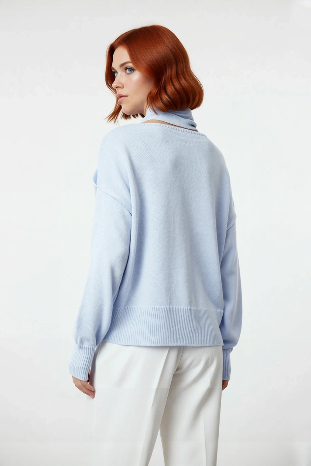 Kadınlara özel olarak tasarlanan bu oversize triko kazak, benzersiz iki parçalı yapısıyla hem rahatlığı hem de modern şıklığı bir araya getiriyor. %100 akrilik materyalden üretilen bu kazak, kış aylarının soğuk günlerinde üstün sıcaklık ve yumuşak bir dokunuş sunarken, gün boyu konforunuzu garanti eder. Düz deseni ve sakin mavi rengi, kolay kombinlenebilirlik sağlayarak gardırobunuzun joker parçası olmaya adaydır. Rahat kalıbı ve basic silueti sayesinde stilinize zahmetsiz bir zarafet katabilirsiniz.