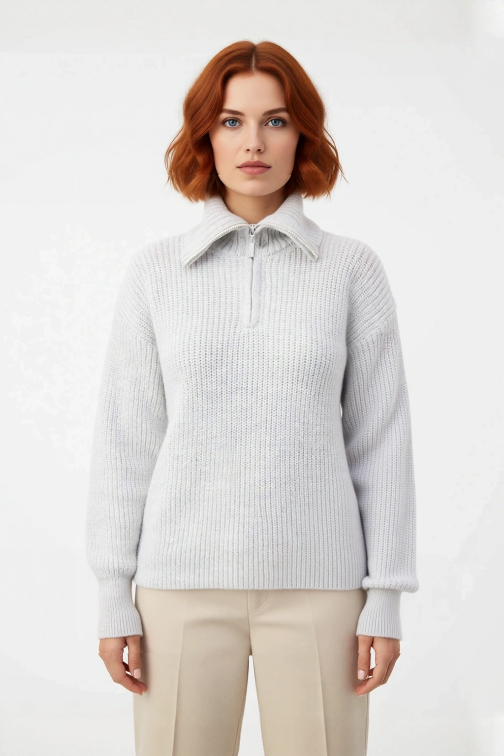 Ürün Özellikleri: Regular kalıp, akrilik polyester poliamid materyal, düz desen, fermuarlı dik yaka, düşük kol, triko kumaş, gri renk.