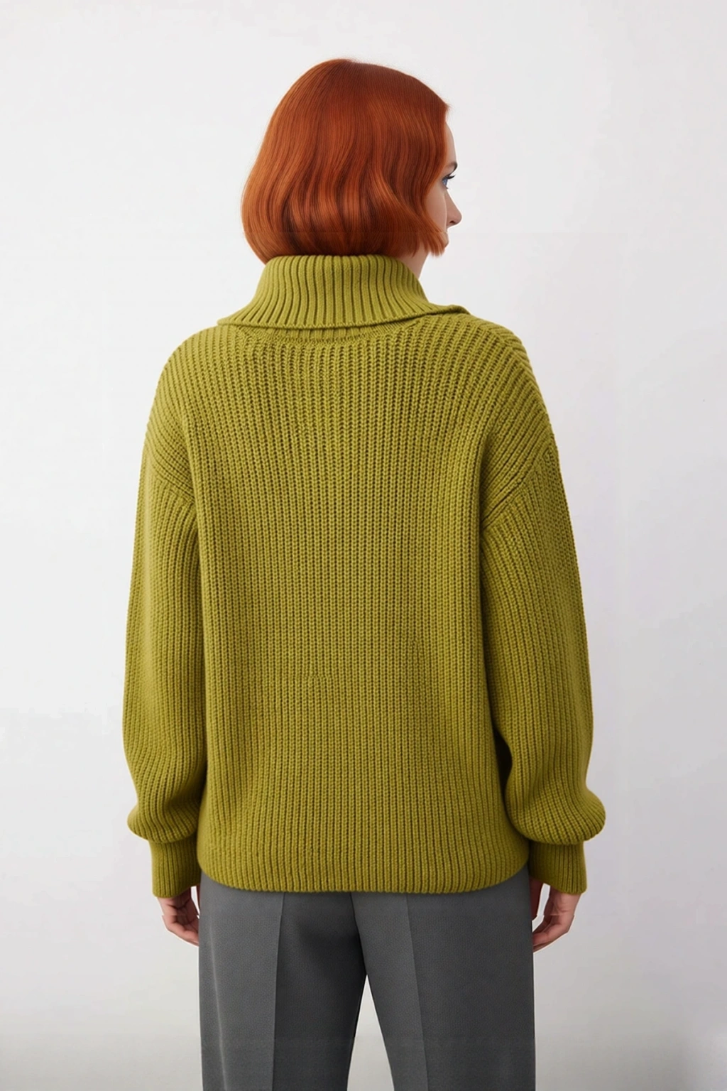 Özellikle soğuk havalar için tasarlanmış fermuarlı dik yaka, boynunuzu nazikçe sararak rüzgardan ve soğuktan korur; aynı zamanda tarzınıza modern ve dinamik bir hava katar. Dilerseniz fermuarı açıp yakanızı genişletebilir veya kapatarak ekstra sıcaklık sağlayabilirsiniz. Düşük kol tipi ve uzun kol boyu, gün boyu rahat hareket imkanı sunarak salaş bir görünüm yaratır. Selanik dokuma tipi, kazağa estetik bir derinlik ve dokulu bir yüzey kazandırırken, triko kumaşın nefes alabilen yapısı cildinize dost bir dokunuş sunar. Bu dayanıklı materyal karışımı, uzun süreli kullanımlarda bile ürünün formunu, rengini ve kalitesini korur. Makinede kolayca yıkanabilir olması sayesinde bakımı oldukça pratiktir, böylece zamanınız size kalır.