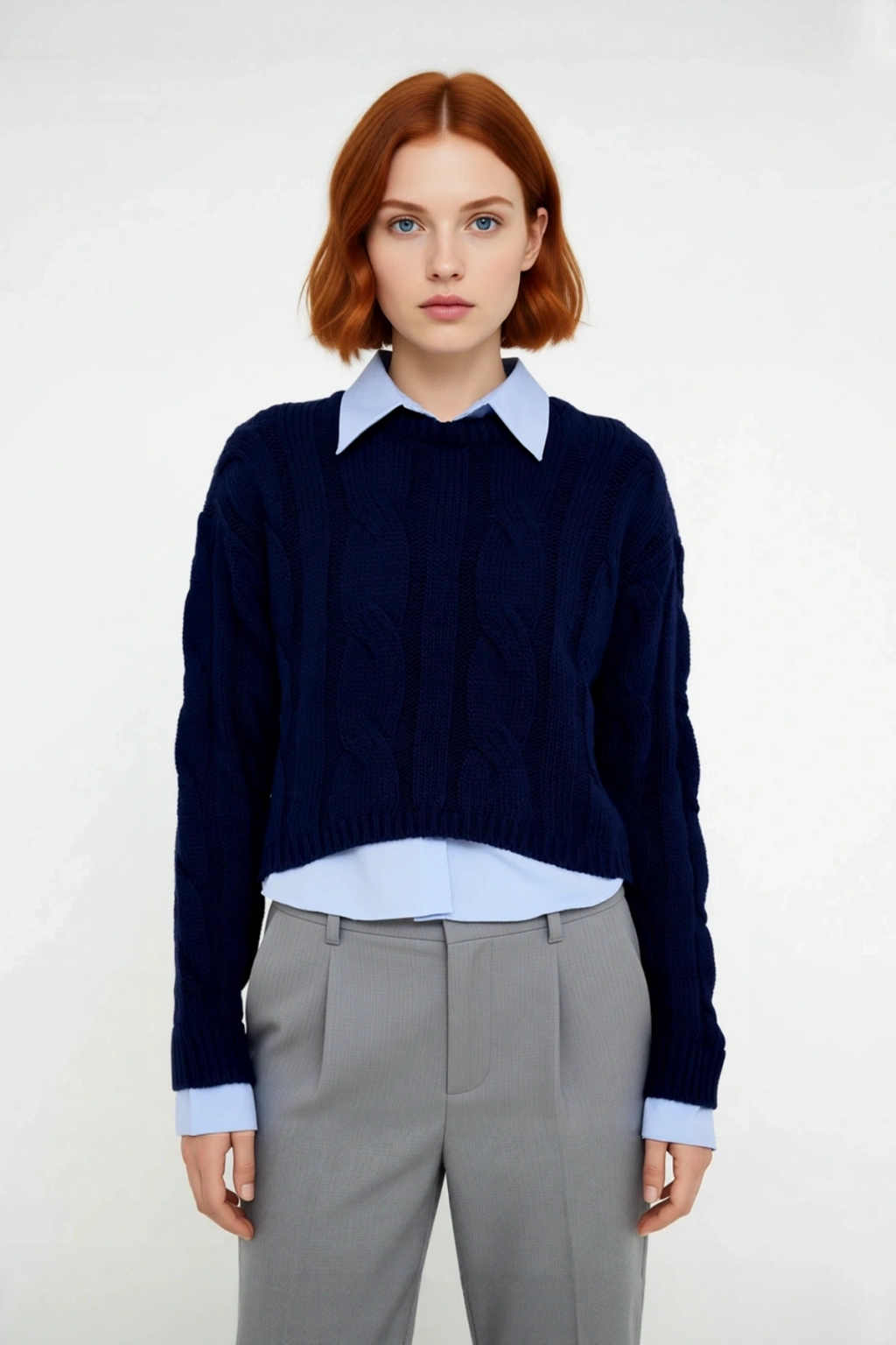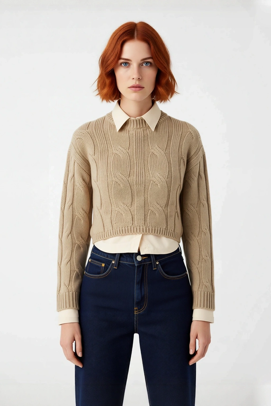 Ürün Özellikleri: Regular kalıp, 100% akrilik materyal, saç örgü desen, bisiklet yaka, düşük kol, triko kumaş, kahverengi renk, super crop boy.