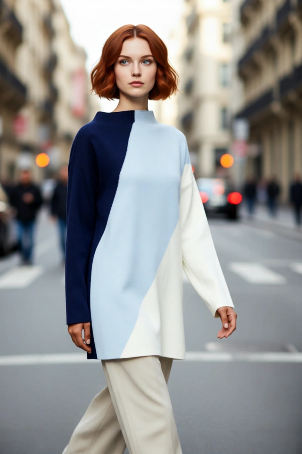 Ürün Özellikleri: Relaxed kalıp, 100% akrilik materyal, renk bloklu desen, dik yaka, düşük kol, triko kumaş, lacivert/açık mavi/krem renk.
