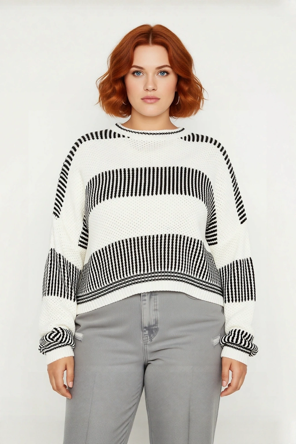 Kadınlara özel tasarlanan bu rahat kesim çizgili bisiklet yaka triko kazak, günlük şıklığınızı tamamlamak üzere hazırdır. %100 akrilik materyalden üretilen bu kazak, yumuşak ve sıcak tutan dokusuyla soğuk günlerde bile üstün konfor sağlar. Ekru rengi üzerine işlenmiş modern çizgili deseni, dinamik ve stil sahibi bir görünüm sunar. Crop boy kesimi genç ve enerjik bir hava katarken, relaxed kalıbı sayesinde gün boyu rahat hareket imkanı tanır. Bu triko kazak, hem casual kombinlerinizde hem de daha özel anlarda dikkat çekici bir parça olarak öne çıkar.