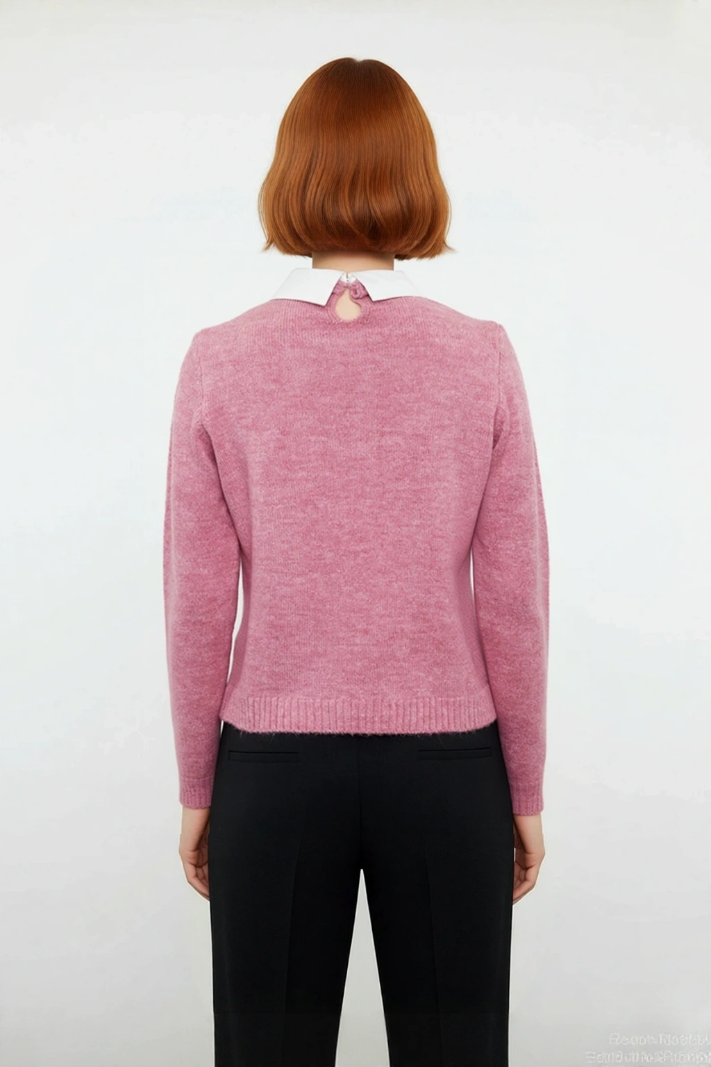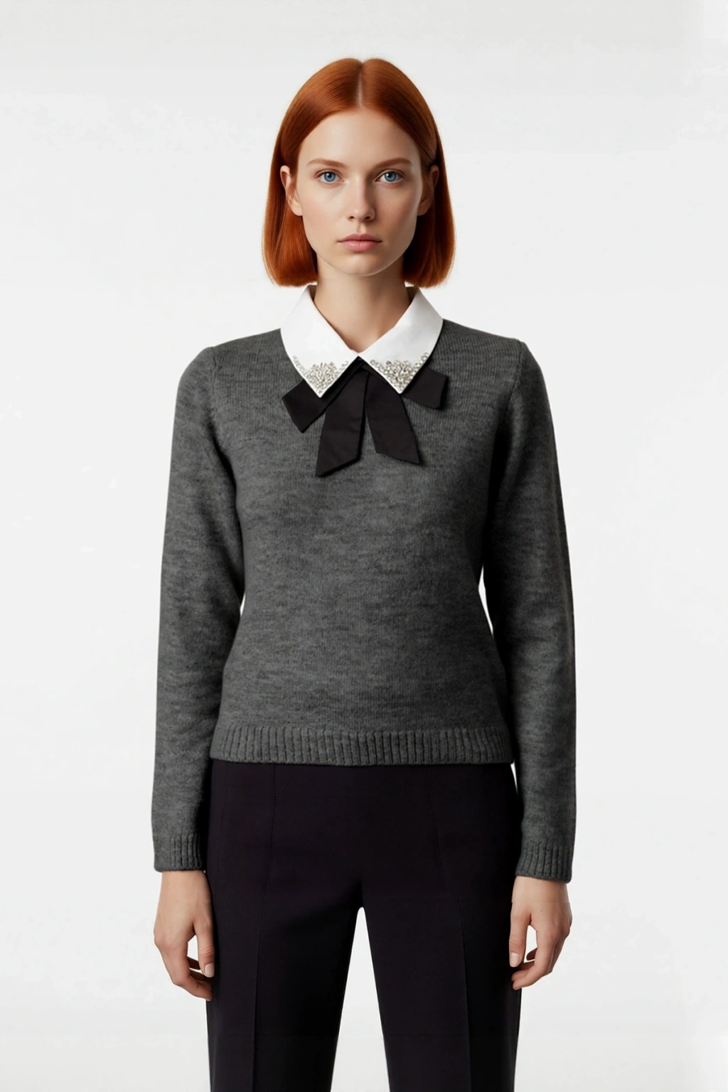 Bu zarif Kadın Triko Kazak, regular kalıbıyla vücuda nazikçe oturarak hem rahatlık hem de şık bir siluet sunar. Yumuşak dokulu, akrilik ve polyester karışımlı triko materyali sayesinde kış aylarında sıcaklığı ve konforu bir arada yaşatır. Antrasit rengin asil duruşu, gömlek garnili yaka ile birleşerek modern bir zarafet sergiler. Yaka kısmını süsleyen parlak taş işlemeleri ve zarif kurdele fiyonk detayı, kazağa eşsiz ve feminen bir hava katarak sıradanlığın ötesine taşır. Bu tasarım, stil sahibi kadınların günlük ve özel anlarda kendilerini özel hissetmelerini sağlar.