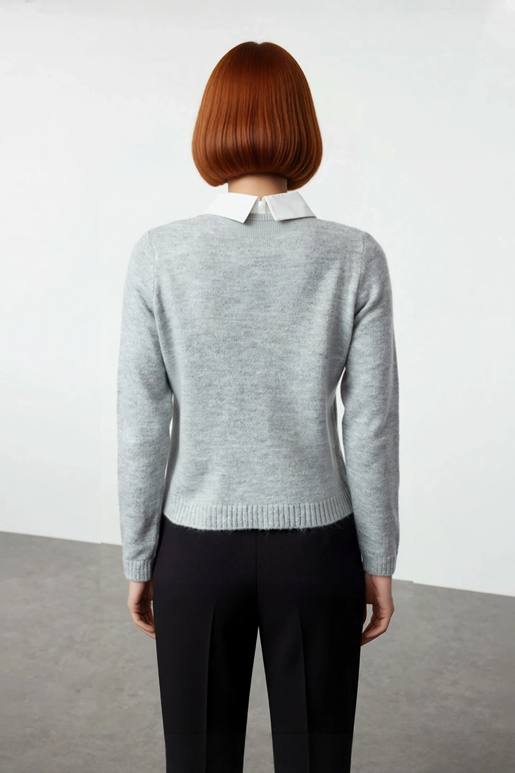 Ürün Özellikleri: Regular kalıp, Akrilik materyal, Nakışlı / İşlemeli desen, Gömlek Yaka Görünümlü, Standart kol, Triko kumaş, Gri renk.