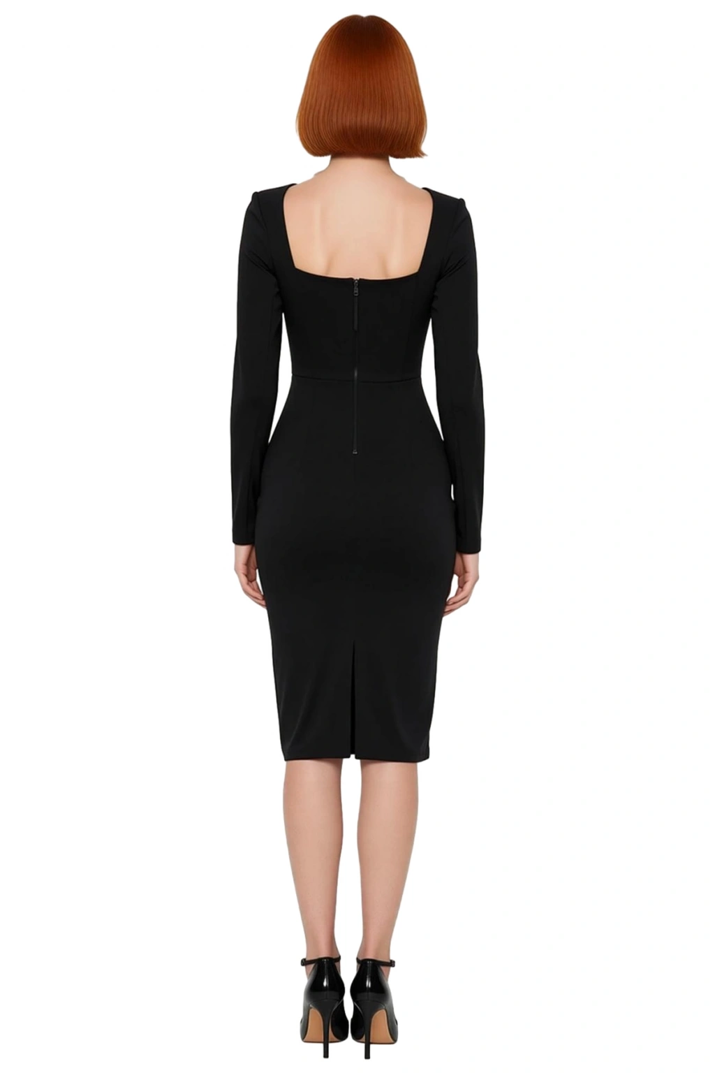 Ürün Özellikleri: Bodycone kalıp, polyester karışımlı materyal, düz desen, kare yaka, uzun standart kol, dokuma kumaş, siyah renk, taş aksesuar.