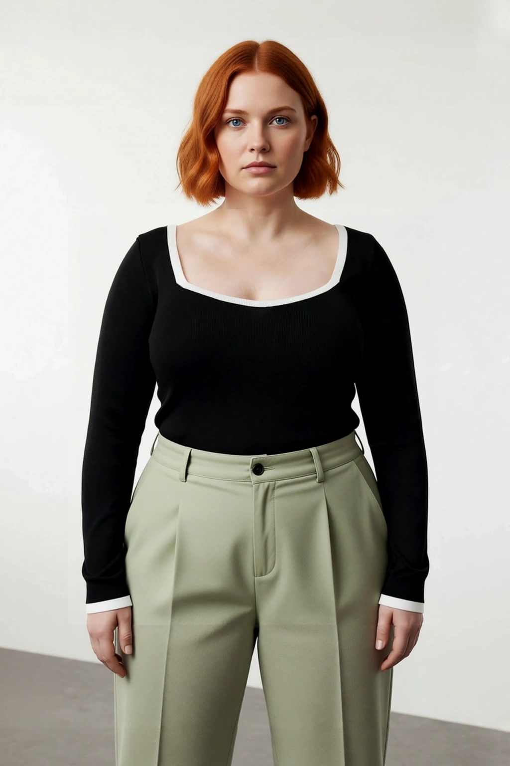Kadınlar için tasarlanan bu siyah triko bluz, fitted kesimi ve bodycone siluetiyle vücut hatlarınıza kusursuzca uyum sağlar, çekici bir görünüm sunar. %100 polyester materyalden üretilen bu ince triko, gün boyu nefes alabilirlik ve yumuşak bir dokunuş vaat eder. Düz renk seçeneği, kare yaka, kol ağzı ve etek ucundaki zarif beyaz biyelerle hareketlendirilerek modern ve dinamik bir stil yaratır. Casual ve günlük kombinleriniz için vazgeçilmez bir parçadır.