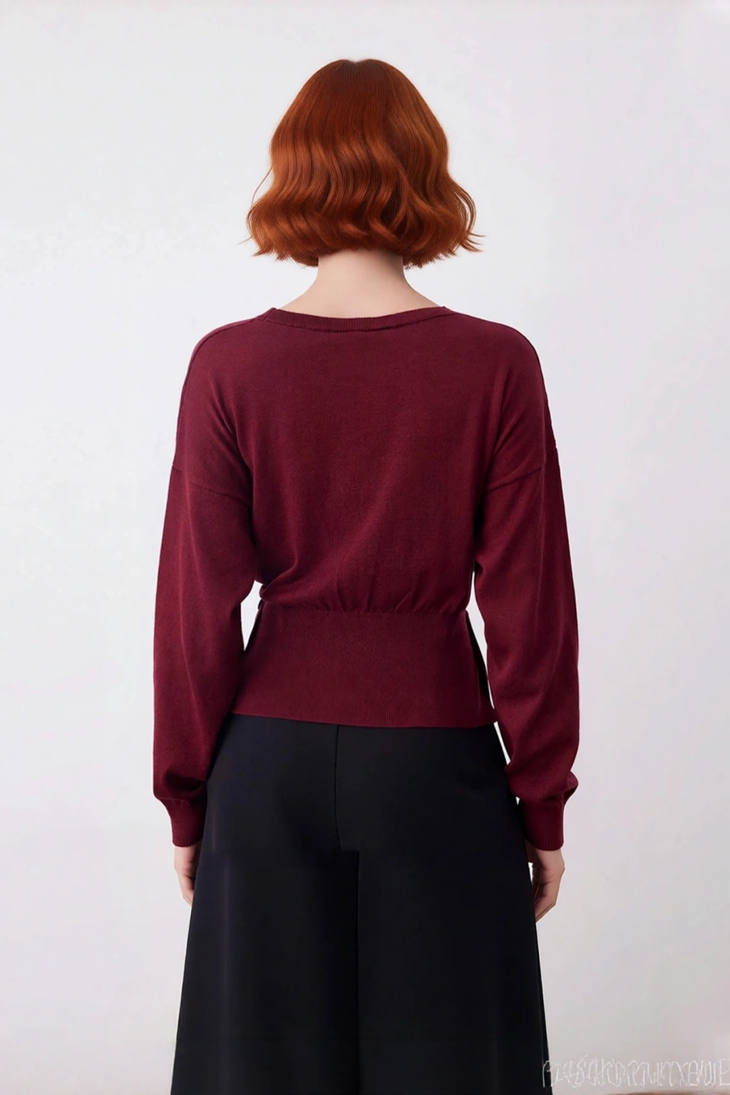 Ürün Özellikleri: Fitted kalıp, pamuk akrilik karışım materyal, düz desen, bisiklet yaka, standart kol, triko kumaş, bordo renk.