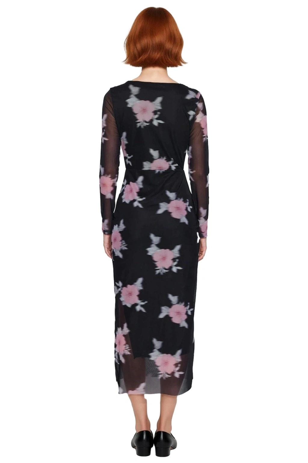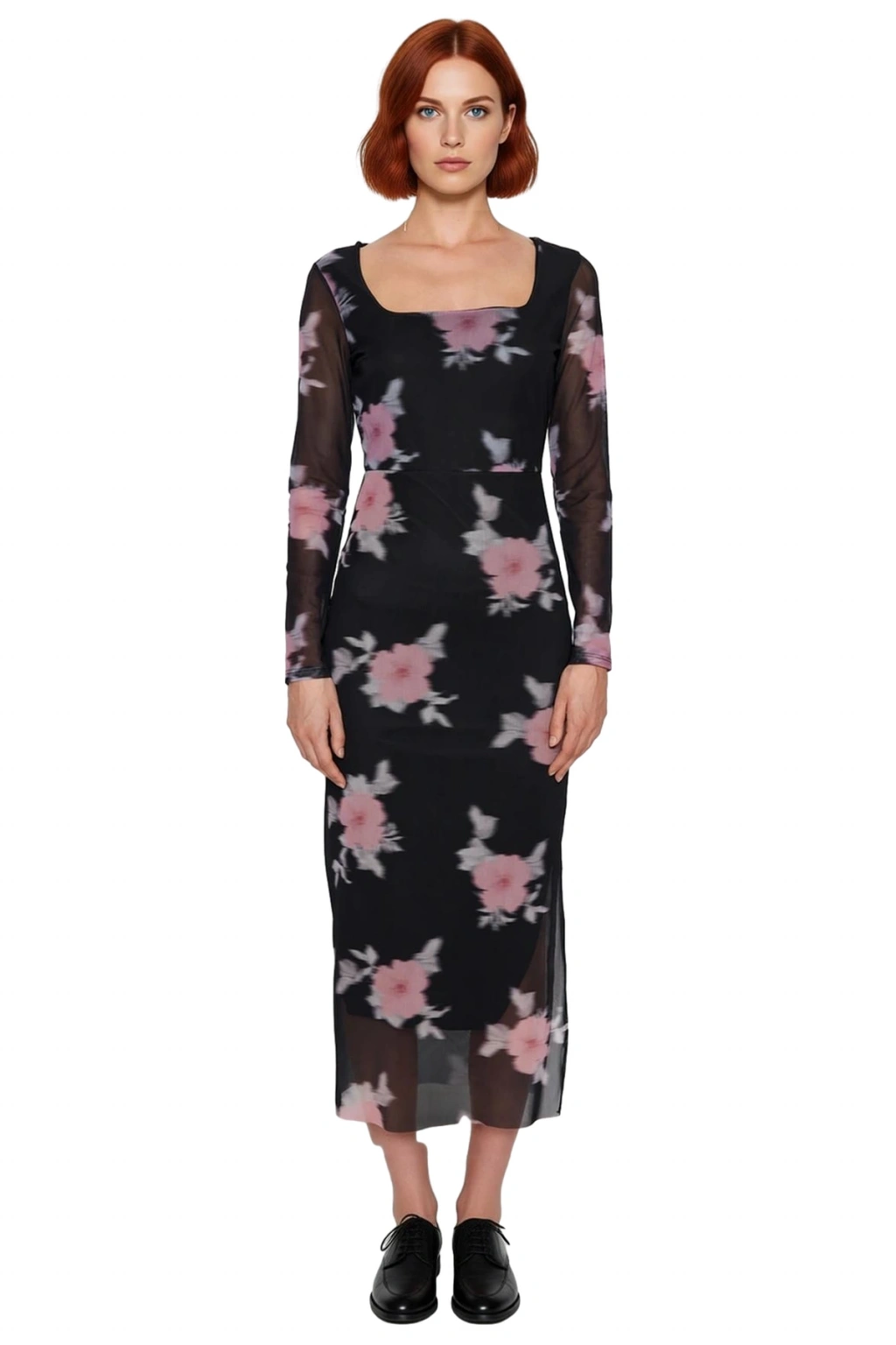 Ürün Özellikleri: Bodycon kalıp, polyester karışımlı materyal, çiçekli desen, kare yaka, standart kol, örme kumaş, siyah renk, astarlı tasarım, maxi boy.