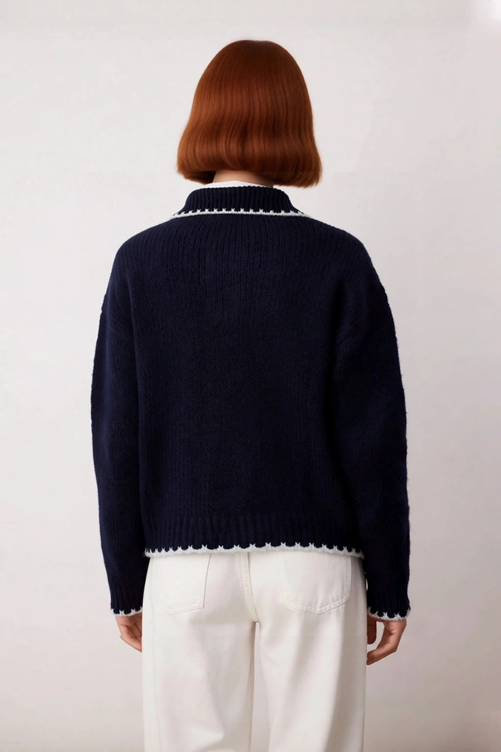 Lacivert Kadın Triko Kazak, soğuk havalarda stilinizden ödün vermeden sıcak kalmak isteyenler için tasarlandı. Oversize kalıbı sayesinde modern ve rahat bir görünüm sunarken, lacivert ana rengi kontrast oluşturan beyaz detaylarla zenginleştirilmiştir. Yüksek kaliteli %79 Akrilik ve %21 Polyester materyal bileşimi, yumuşak dokusuyla cildinize dost, aynı zamanda orta kalınlığıyla etkili bir sıcaklık sağlar. Bu kazak, şıklığı ve fonksiyonelliği bir araya getirerek günlük kullanımda favori parçanız olacak.