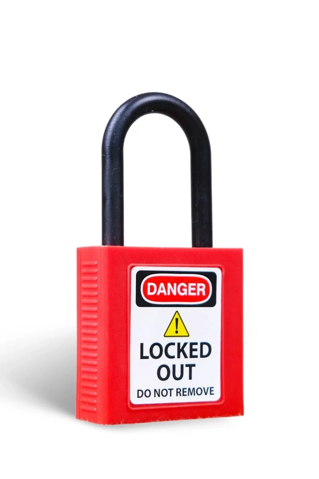 İş güvenliğinde olmazsa olmaz yüksek güvenlikli asma kilit, kırmızı renkli, sağlam gövdesi ve çelik kancası ile dikkat çekiyor.