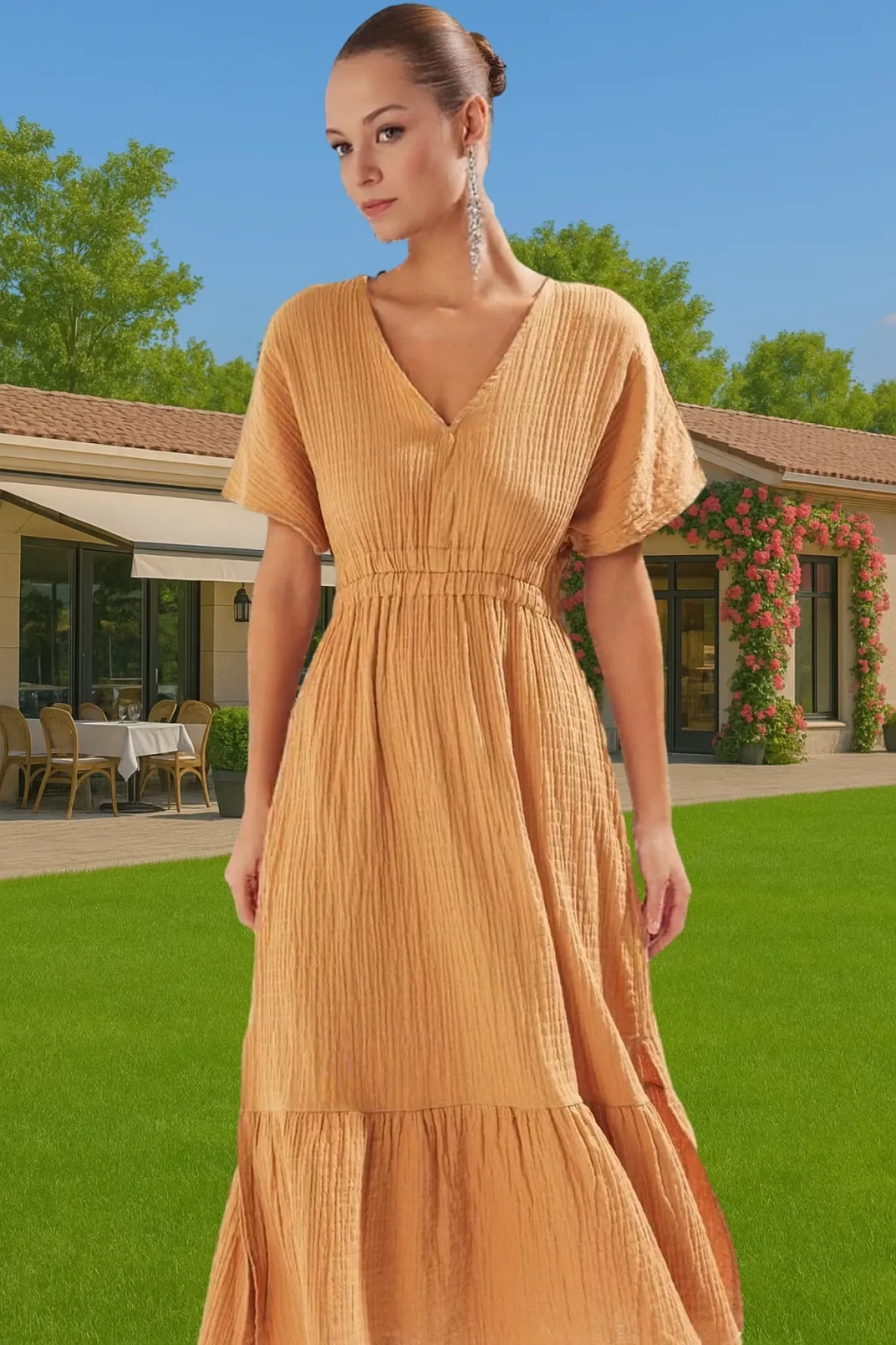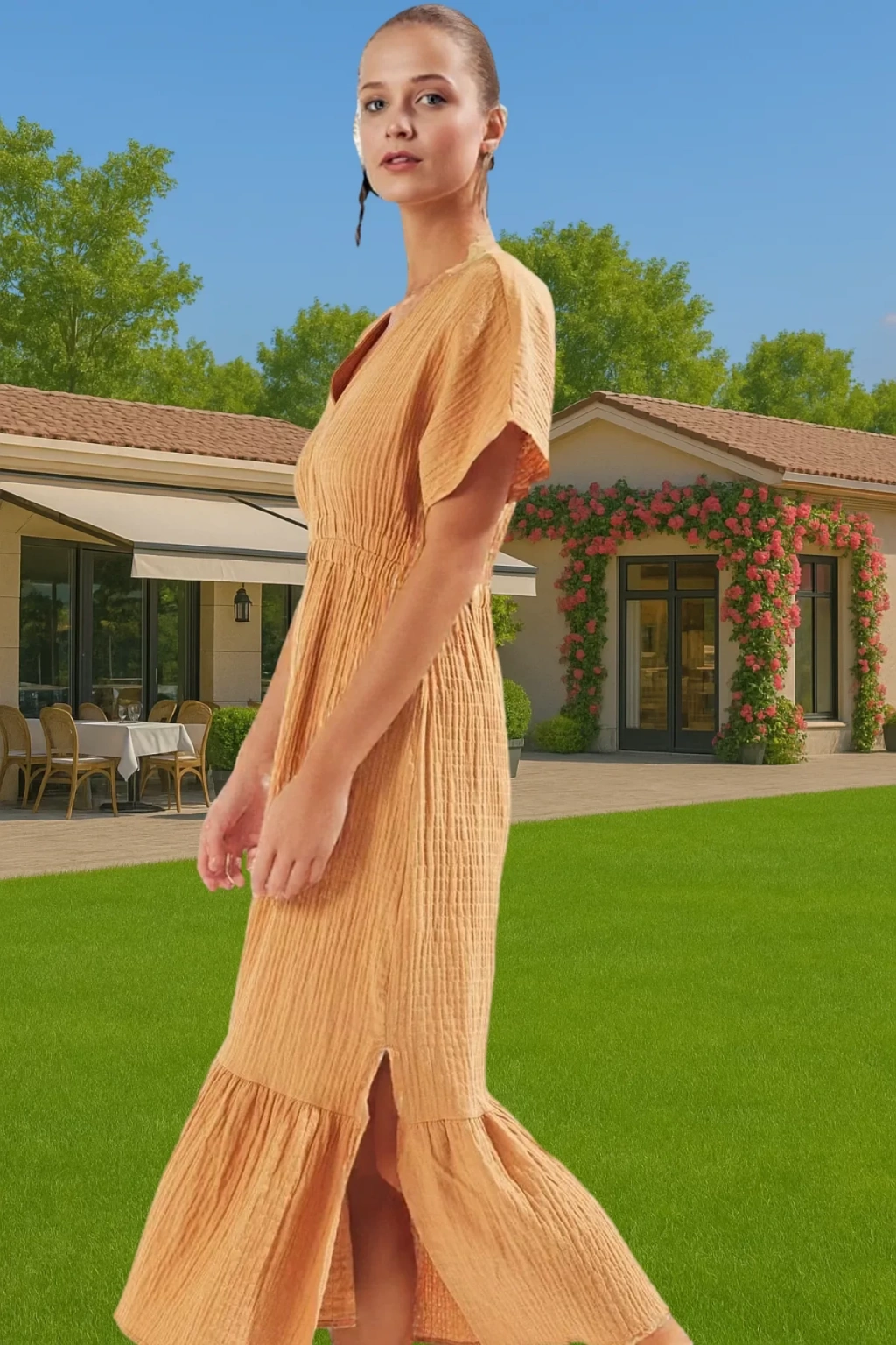 Yazın sıcağında serin ve şık kalmanın en kolay yolu, bu muhteşem müslin plaj elbisesi ile mümkün! Hafif ve nefes alan dokusuyla gün boyu konfor sunarken, zarif büzgü detaylarıyla da stilinizi ön plana çıkarıyor. Maxi boyu ve rahat kesimiyle kendinizi özgür ve rahat hissedeceksiniz. Plajda, havuz başında veya şık bir akşam yemeğinde, her ortamda göz alıcı görünmenizi sağlayacak. 100% pamuk müslin kumaştan üretilen elbise, yumuşak dokusu ve nefes alabilir özelliği ile teninize mükemmel bir uyum sağlar. Büzgü detaylı bel kısmı, vücut hatlarınızı zarifçe vurgulayarak feminen bir görünüm kazandırırken, kısa kollu tasarımı ve maxi boyu ile sıcak yaz günlerinde serin kalmanıza yardımcı olur. Elbisenin yan tarafındaki yırtmaç detayı ise hareket özgürlüğünüzü en üst seviyeye taşır. Kolay bakım gerektirdiğinden, kullanım sonrası temizliği oldukça pratiktir. Modelin ölçüleri: Boy: 177cm(510) Göğüs: 83cm(32in) Bel: 63cm(24in) Kalça: 92cm(36in). Mankenin üzerindeki ürün S368 bedendir. Ürün ön boyu 130 cm'dir. 36-42 beden aralığında mevcuttur. Bu zarif elbiseyi, şık bir şapka ve hasır çantayla tamamlayarak plaj stilinizi tamamlayabilirsiniz. Günlük kullanım için de oldukça uygun olup, farklı aksesuarlarla kombinleyerek her ortama uyum sağlayabilirsiniz. - Kumaş Tipi: Dokuma - Kol Tipi: Tek Kol - Kalıp: Ceket Elbise - Kol Boyu: Kısa - Desen: Düz - Yaka Tipi: Bisiklet Yaka - Ürün Detayı: Büzgü / Drape - Astar Durumu: Astarsız - Boy: Maxi - Persona: Feminine - Siluet: Ceket Elbise - Ortam: Beachwear - Dokuma Tipi: Müslin - Materyal Bileşeni: 100% Pamuk - Sezon: Yaz - Menşei: TR - Modelin Ölçüleri: Boy: 177cm(510) Göğüs: 83cm(32in) Bel: 63cm(24in) Kalça: 92cm(36in) - Mankenin üzerindeki ürün S368 bedendir. - Model Ön Boyu: 130,0 cm