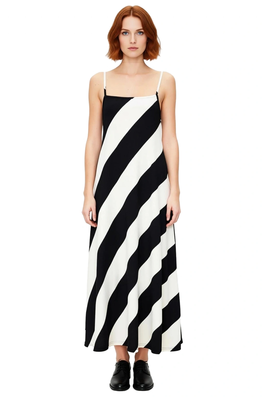 Yaz aylarının vazgeçilmez parçası olacak bu şık maxi elbiseyle tanışın! A-line kalıbı ve ince askılarıyla rahatlığı ve şıklığı bir arada sunuyor. Nefes alan örme kumaş yapısıyla gün boyu konforlu hissedeceksiniz. Canlı çiçek baskılarıyla tarzınıza enerji katacak bu elbise, plajda, şehirde, ya da akşam yemeğinde her yerde harika görünecek.