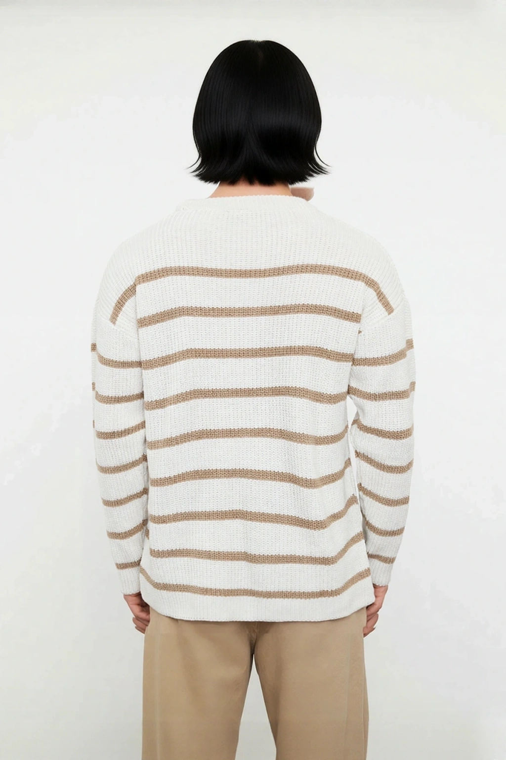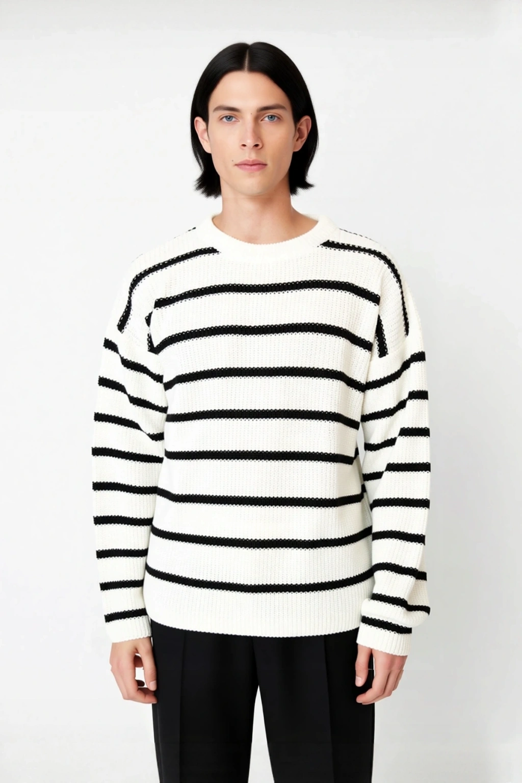 Modern erkeğin tarzını yansıtan bu gri çizgili kazak, oversize kalıbıyla hem rahat hem de trend bir siluet sunar. %100 akrilik materyali sayesinde kış aylarının vazgeçilmezi olurken, soğuk havaya karşı üstün koruma sağlar ve yumuşak dokusuyla gün boyu konforlu bir kullanım deneyimi yaşatır. Çizgili deseni, kazağa dinamik bir hava katarken, gri rengi her türlü kombinle kolayca uyum sağlar. Baskısız ve sade tasarımı, minimalist bir şıklık arayanlar için ideal bir seçimdir.