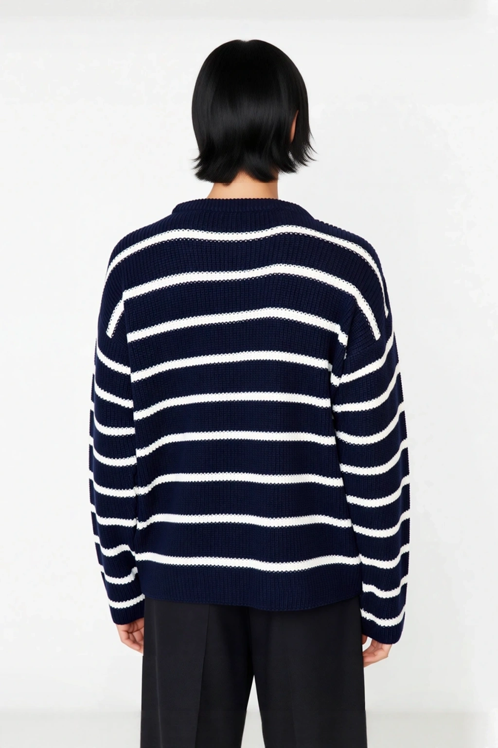 Ürün Özellikleri: Oversize kalıp, 100% akrilik materyal, çizgili desen, bisiklet yaka, standart kol, triko kumaş, gri renk, baskısız tasarım.