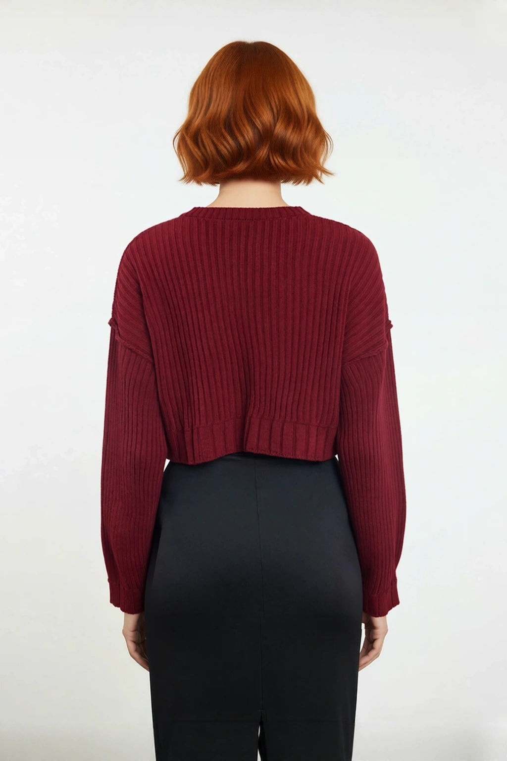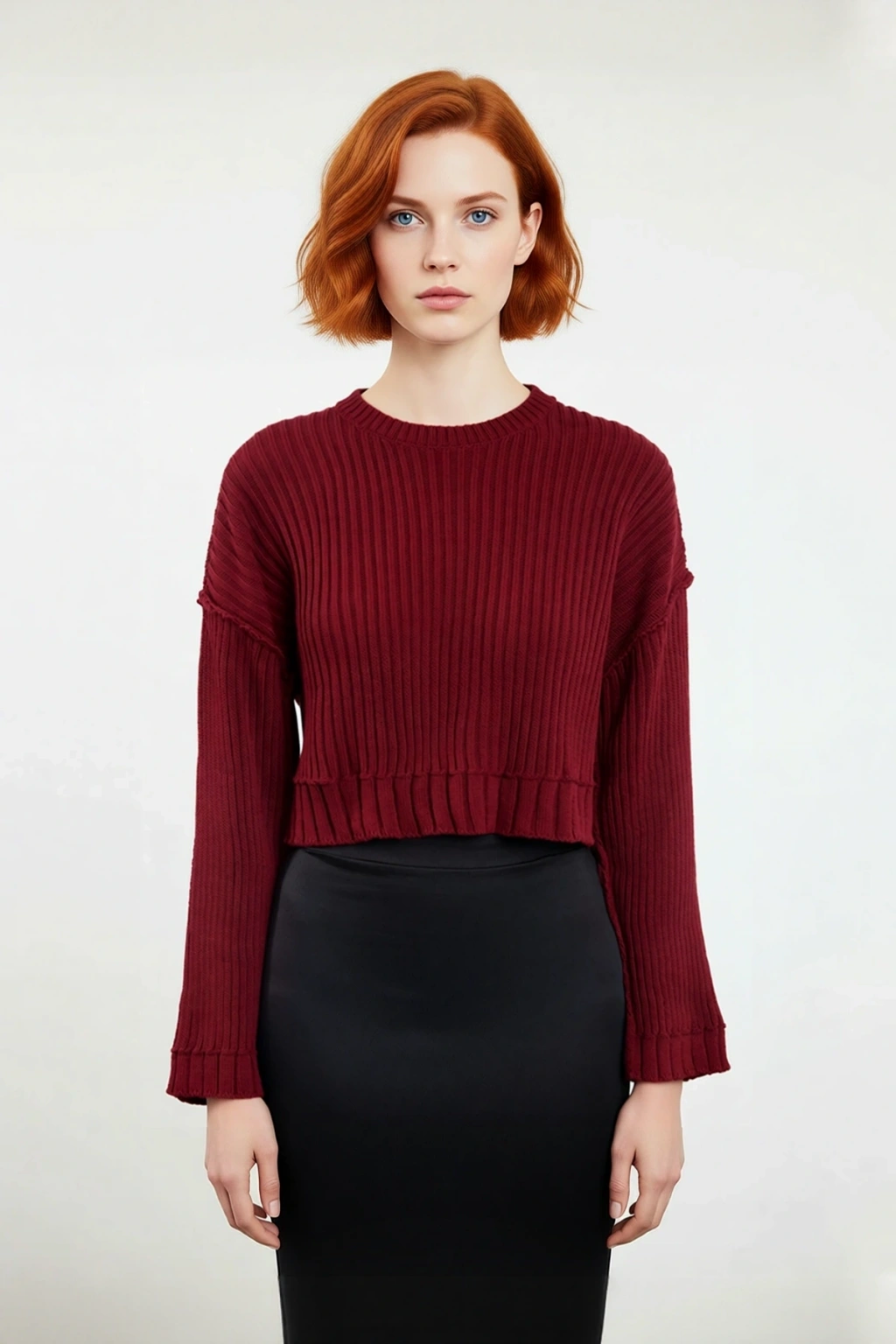 Ürün Özellikleri: Oversize kalıp, akrilik materyal, düz desen, bisiklet yaka, uzun kol, triko kumaş, bordo renk, baskısız tasarım, crop boy.