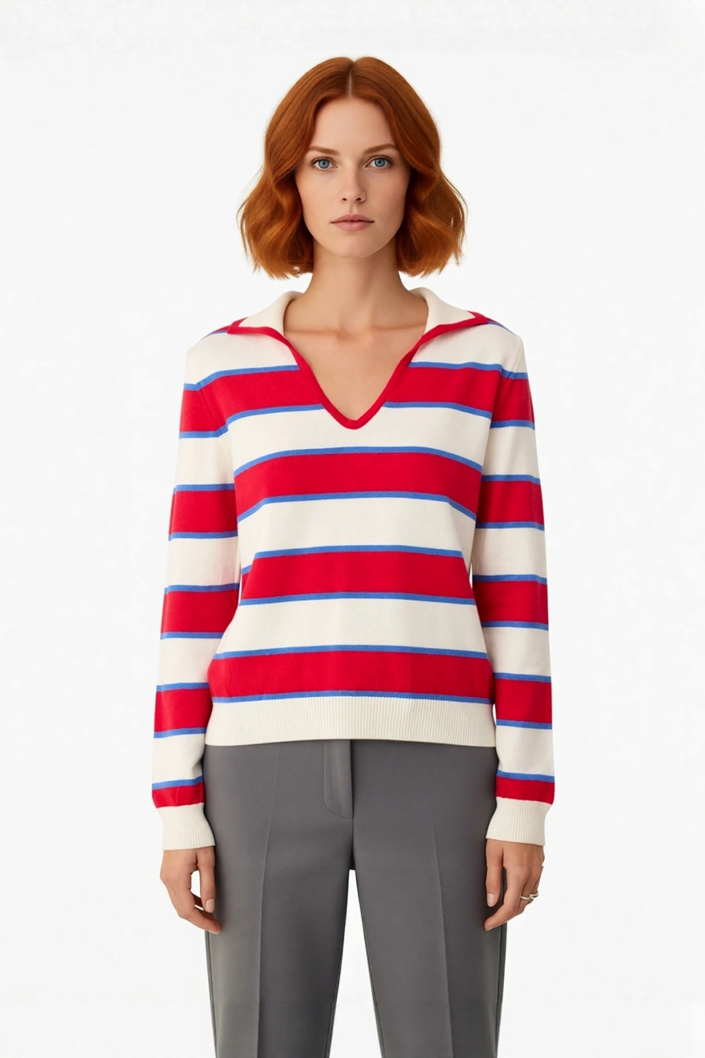 Modern kadınların vazgeçilmezi olacak bu triko kazak, regular kalıbıyla hareket özgürlüğü sunar ve gün boyu rahatlık sağlar. Polo yaka tasarımı, klasik bir zarafet katarken, V-yaka açıklığı ile şık bir dokunuş ekler. Standart kol tipi ve uzun kol boyu, soğuk havalarda ideal koruma sağlarken, ince triko kumaş dokusu sayesinde katmanlı giyime uygundur ve hacimli bir görünüm oluşturmaz. Tek plaka dokuma özelliği, ürünün kalitesini ve dayanıklılığını vurgular. Makinede yıkanabilir olması (T41 yıkama talimatı), bakım kolaylığı sunarak pratik bir kullanım sağlar.