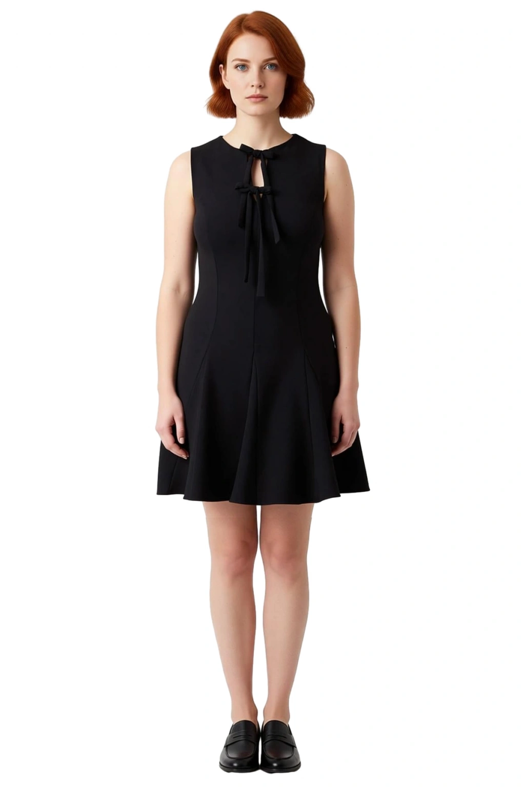 Ürün Özellikleri: A-line kalıp, polyester elastan karışımı, düz desen, fiyonk detaylı bisiklet yaka, kolsuz, dokuma kumaş, mor renk.