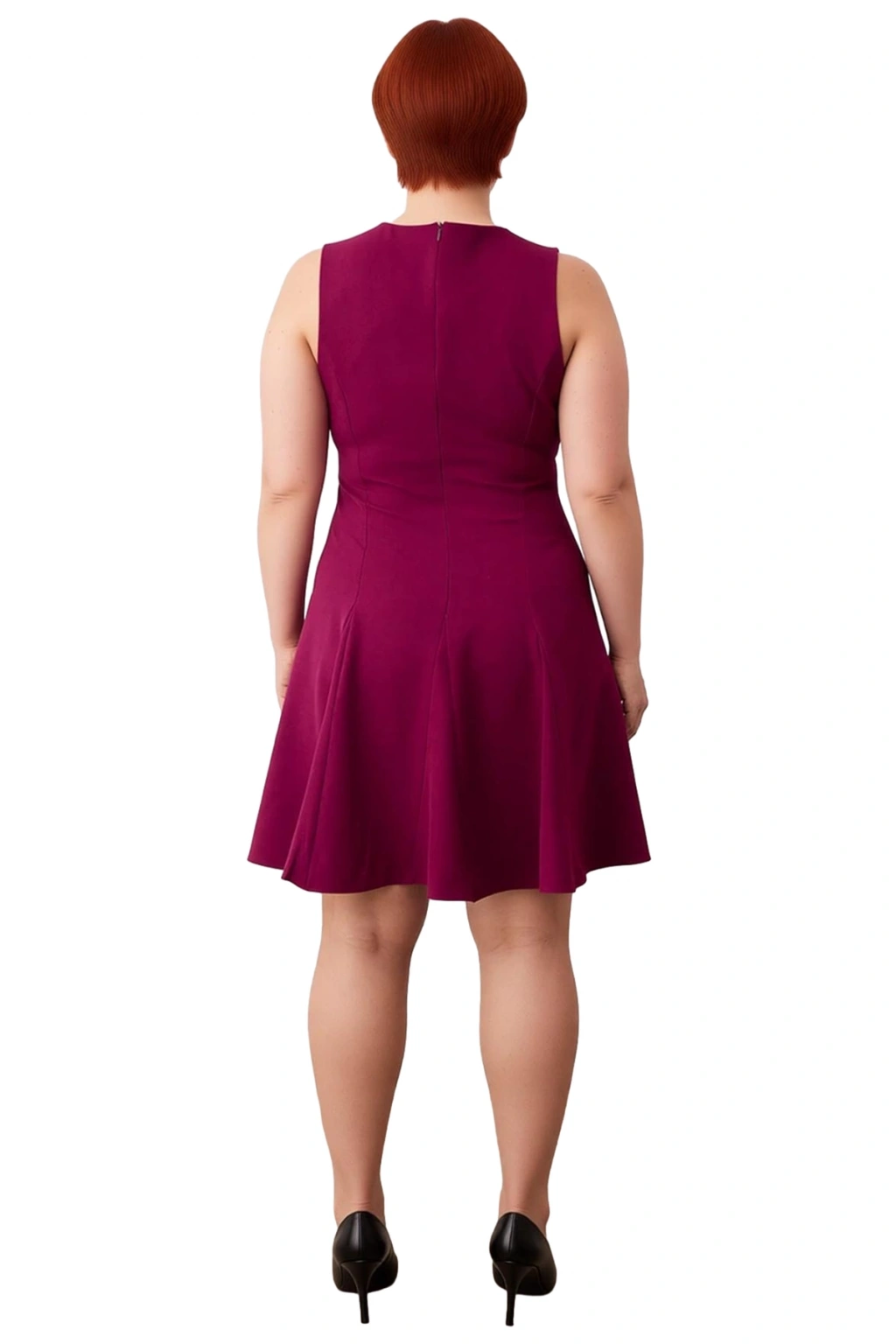 Ürün Özellikleri: A-line kalıp, polyester elastan karışımı, düz desen, fiyonk detaylı bisiklet yaka, kolsuz, dokuma kumaş, mor renk.