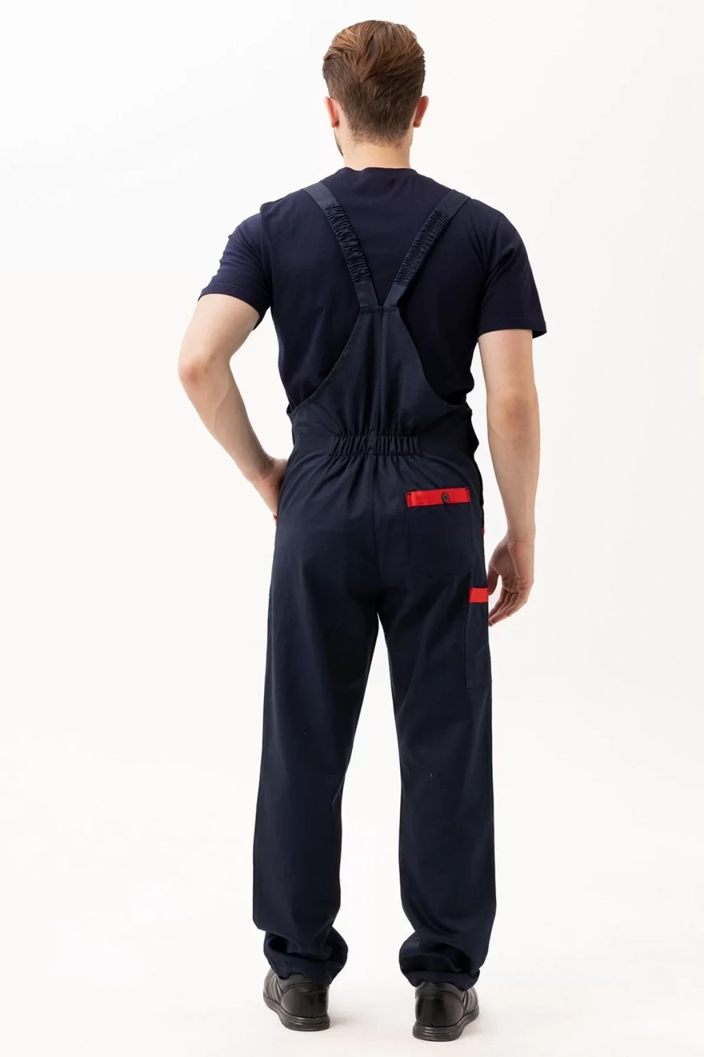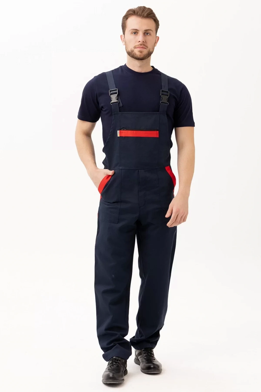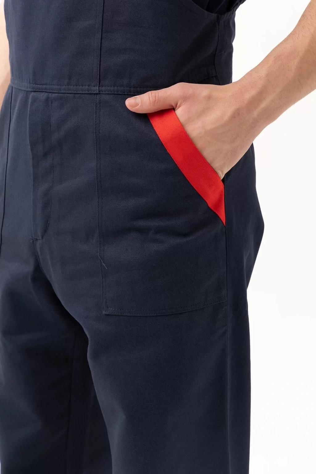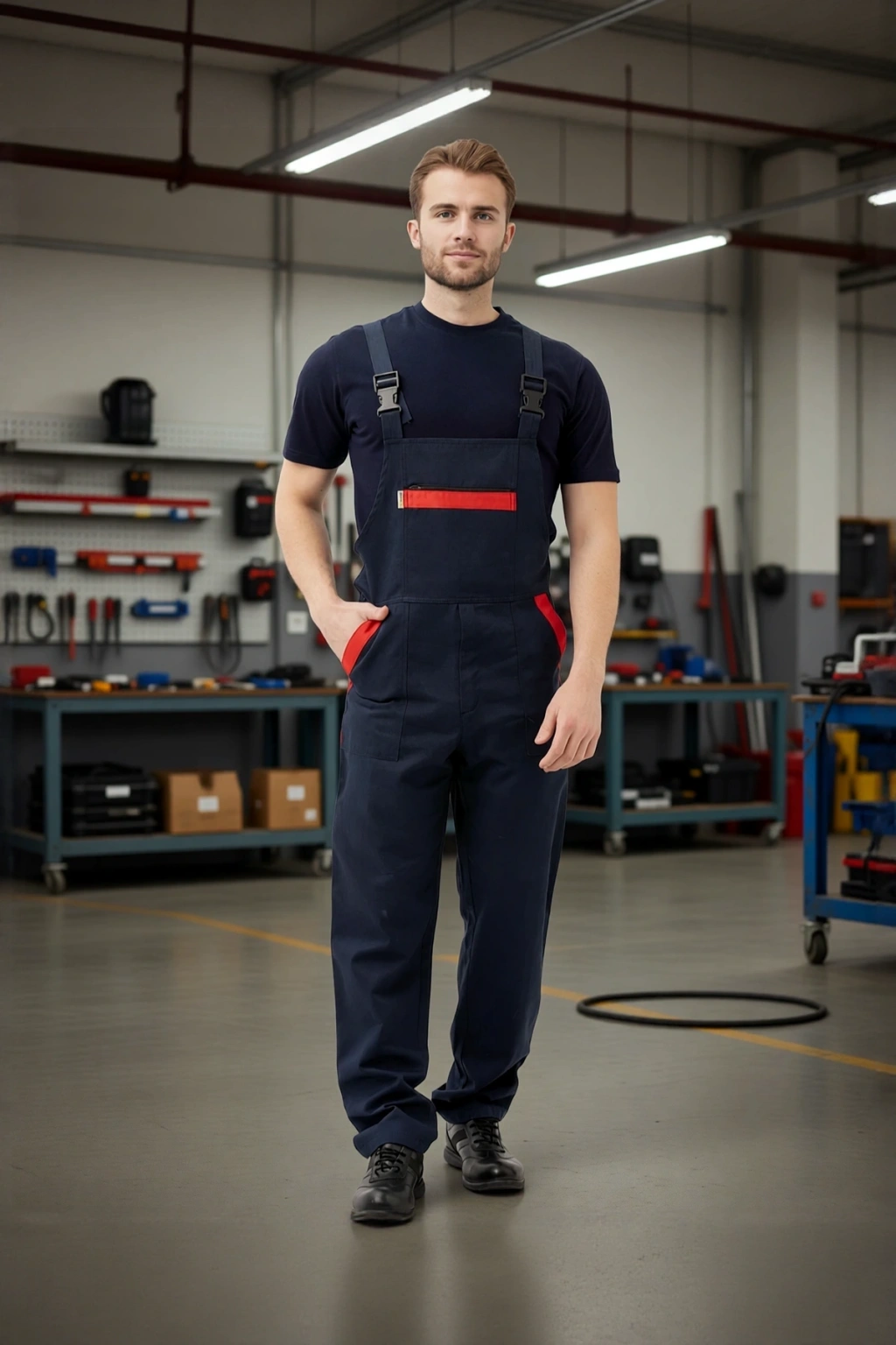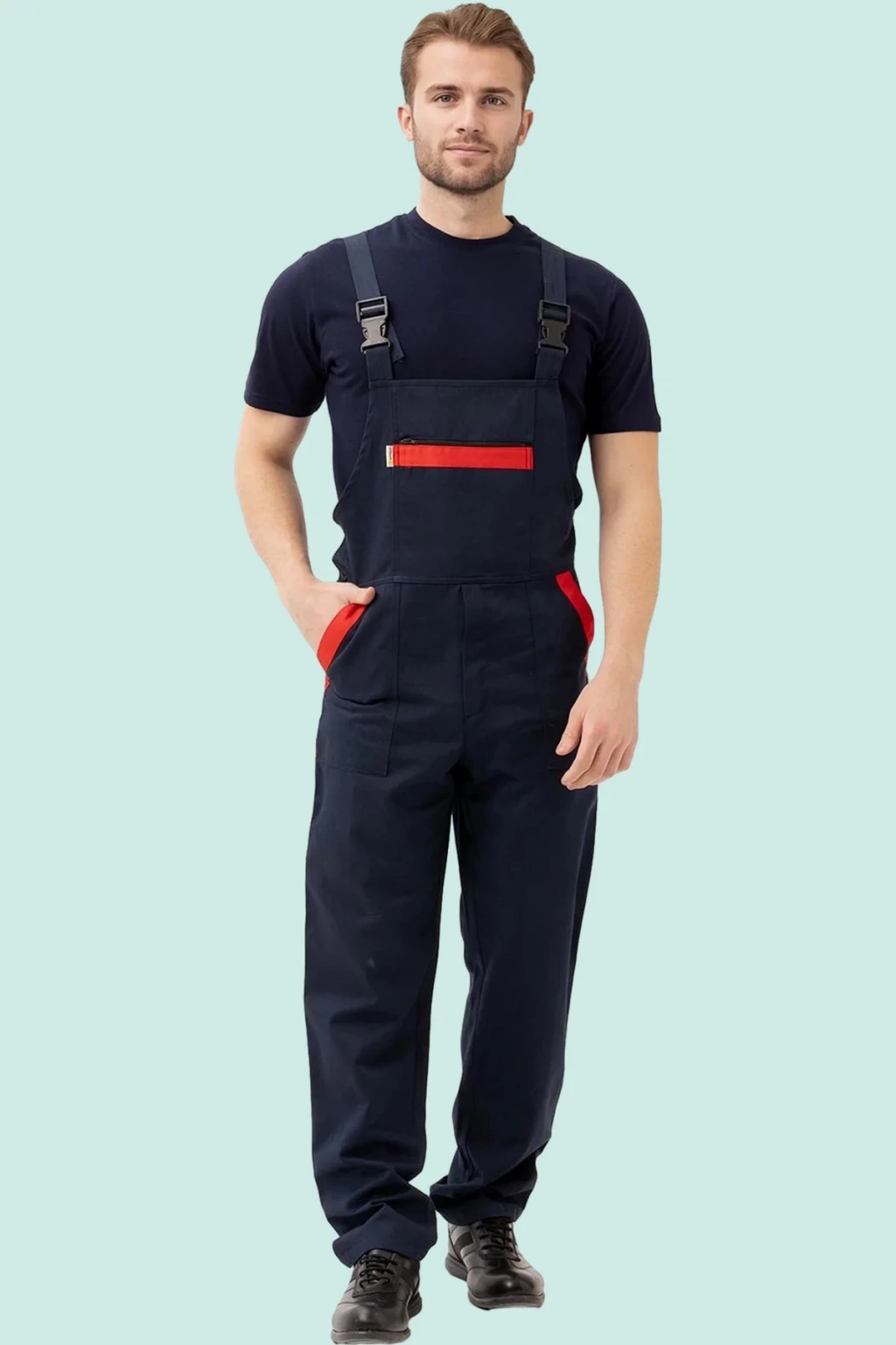Konforlu ve dayanıklı gabardin kumaştan üretilen koyu mavi iş güvenliği tulumu, kırmızı detaylarıyla şık bir görünüm sunuyor. Hem işlevsel hem de şıklığı bir arada arayanlar için ideal bir seçenek.