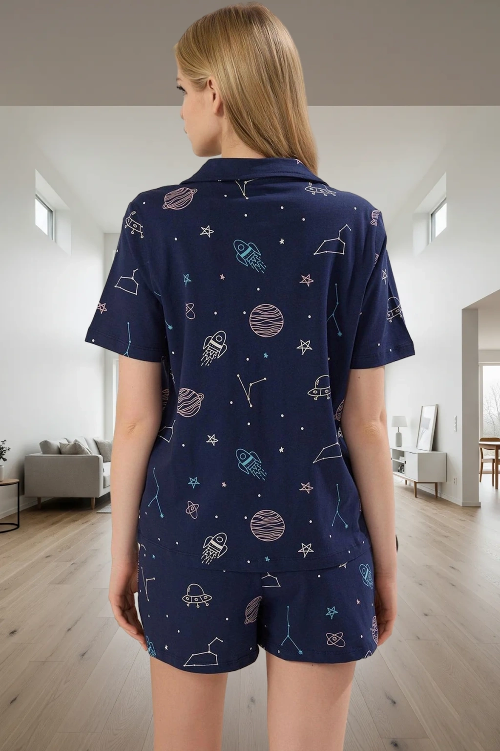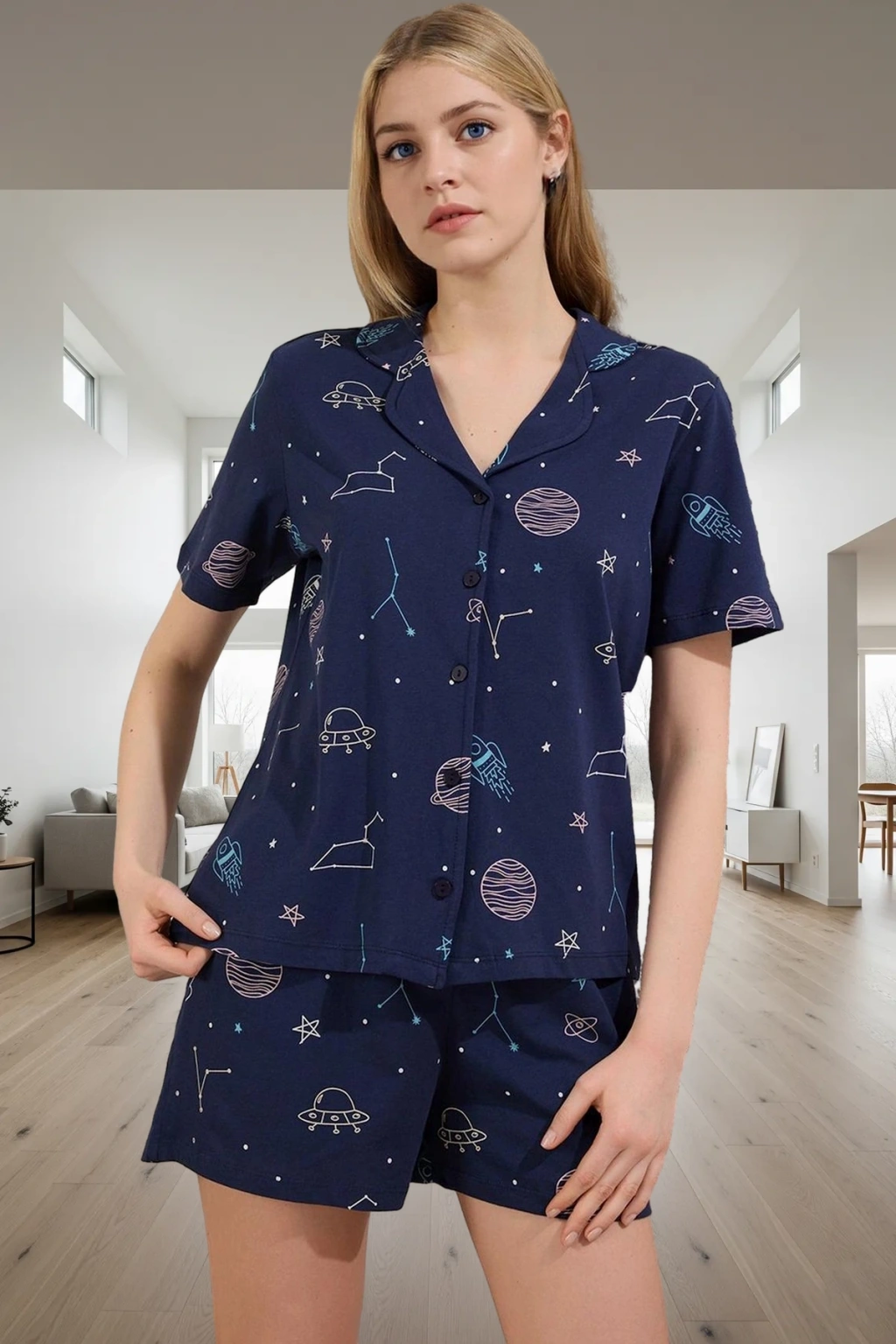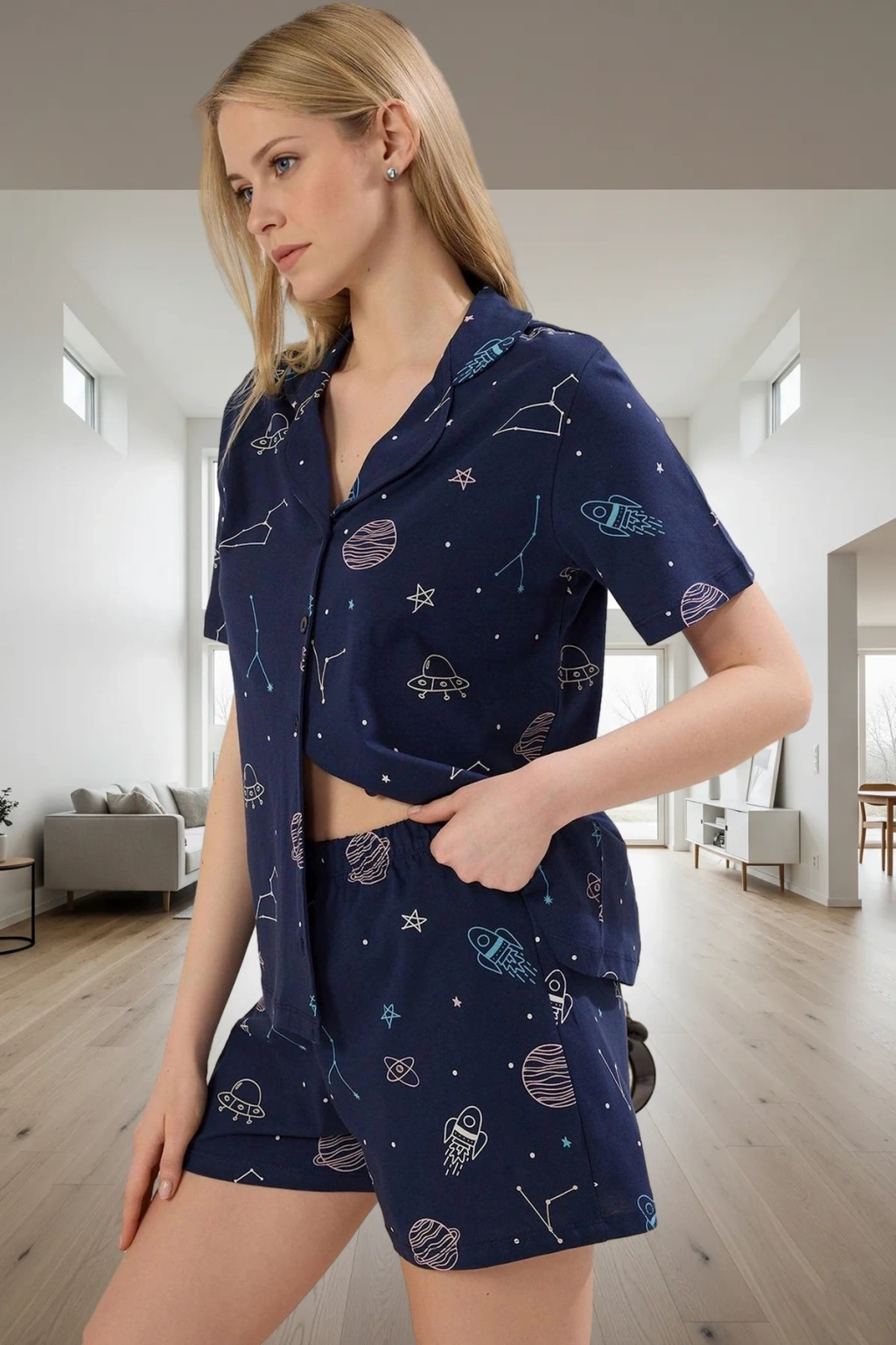 Evde rahatlamak ve keyifli zaman geçirmek için mükemmel bir seçim olan bu pijama takımı, %100 pamuk kumaştan üretilmiştir. Ekru rengi ve galaksi temalı deseniyle şık ve modern bir görünüm sunmaktadır. Kısa kollu gömlek ve boru paça şorttan oluşan takım, yaz aylarında serin kalmanıza yardımcı olurken, regular kalıbıyla da rahat bir uyum sağlar. Yumuşak ve nefes alan dokusuyla, gün boyu konforlu hissetmenizi garanti eder.