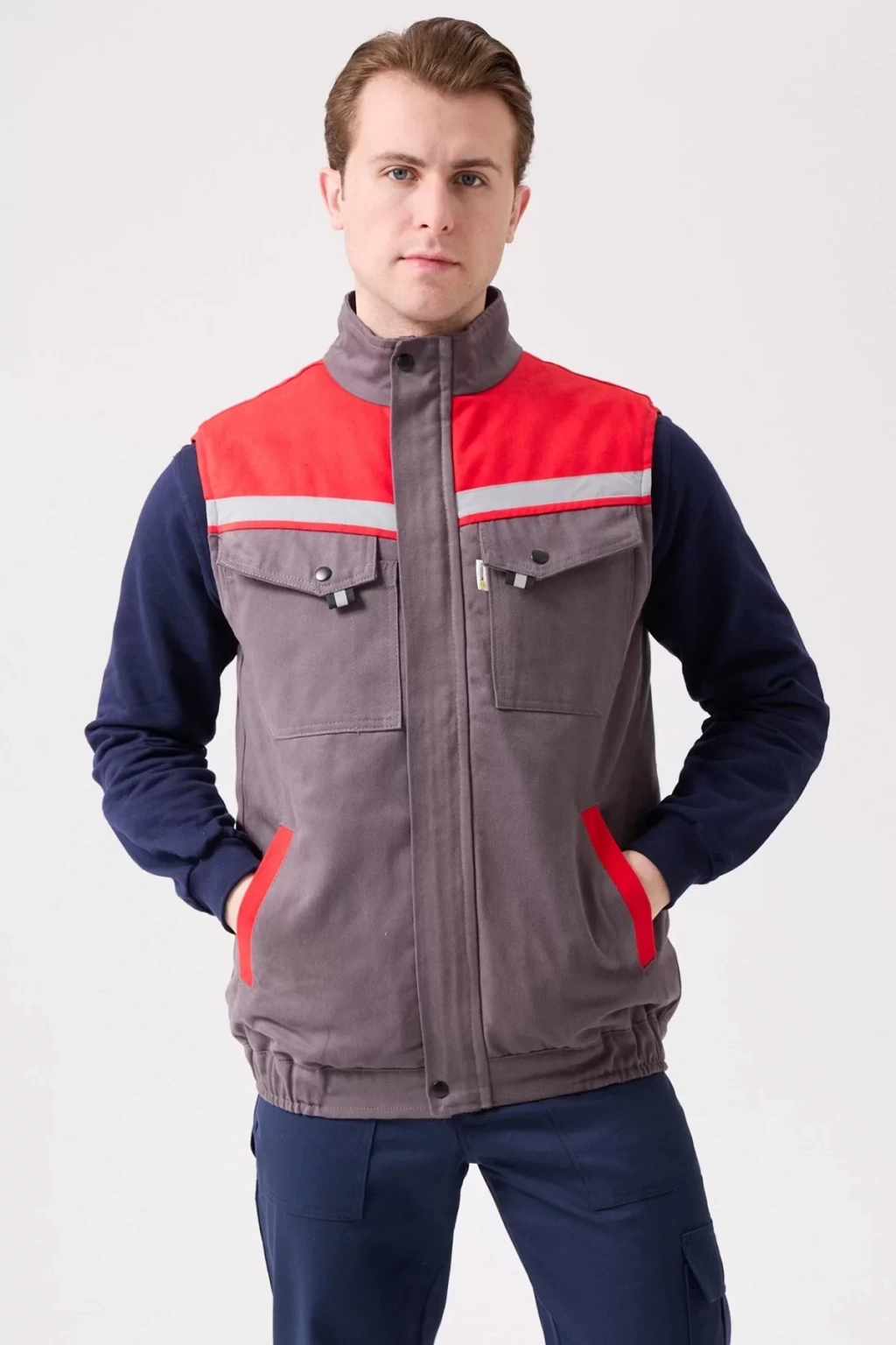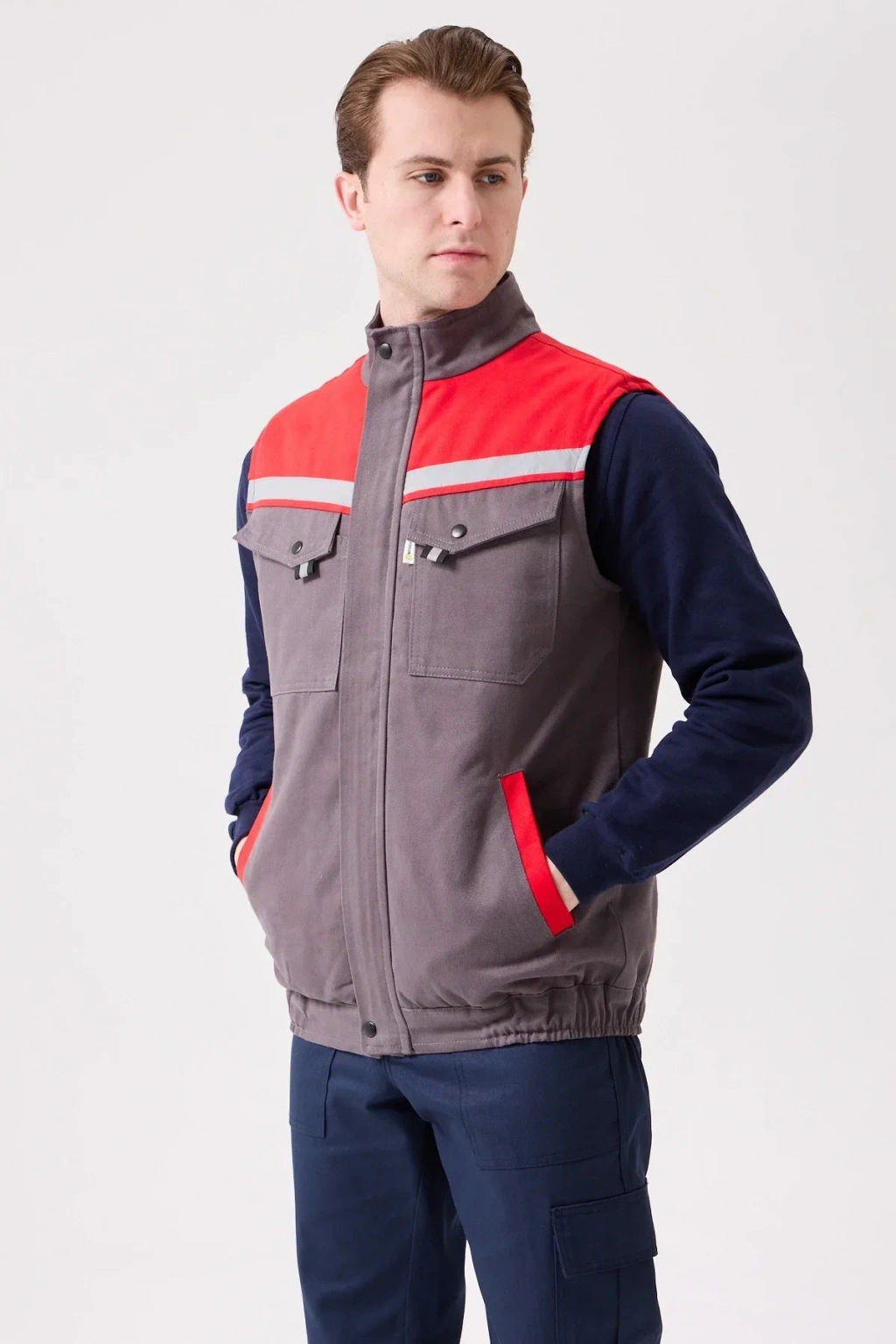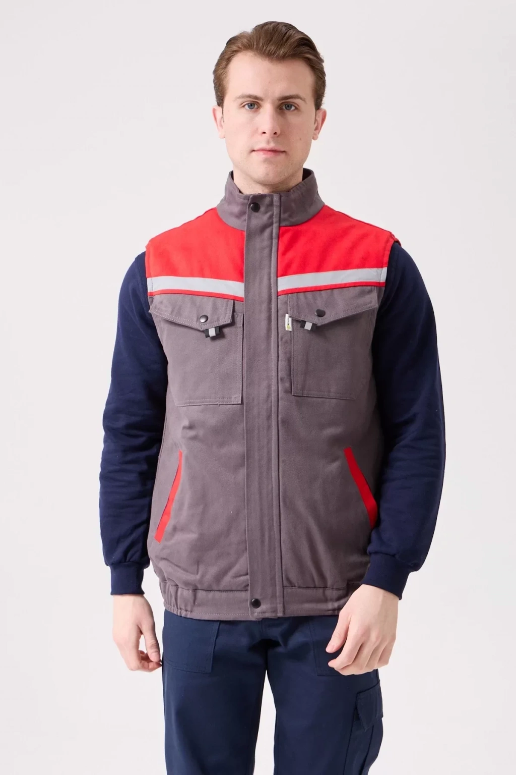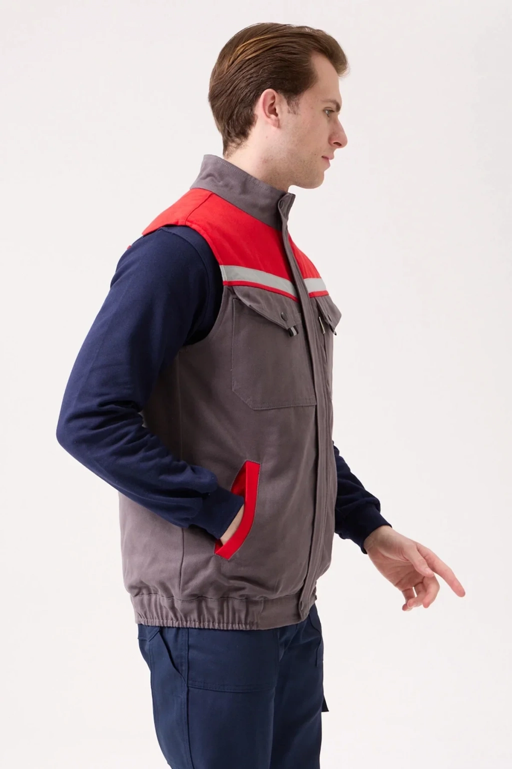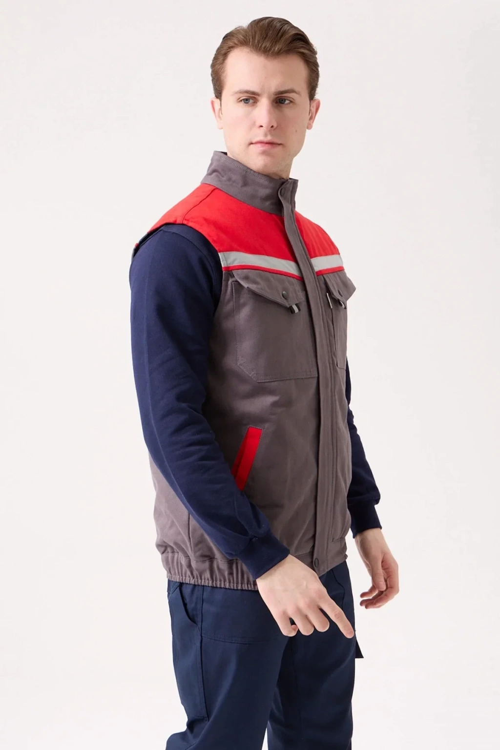 Kışlık İş Yeleği GriKırmızı Gabardin Çok Cepli Royal Sıcak Tutucu Rüzgar Geçirmez Reflektörlü