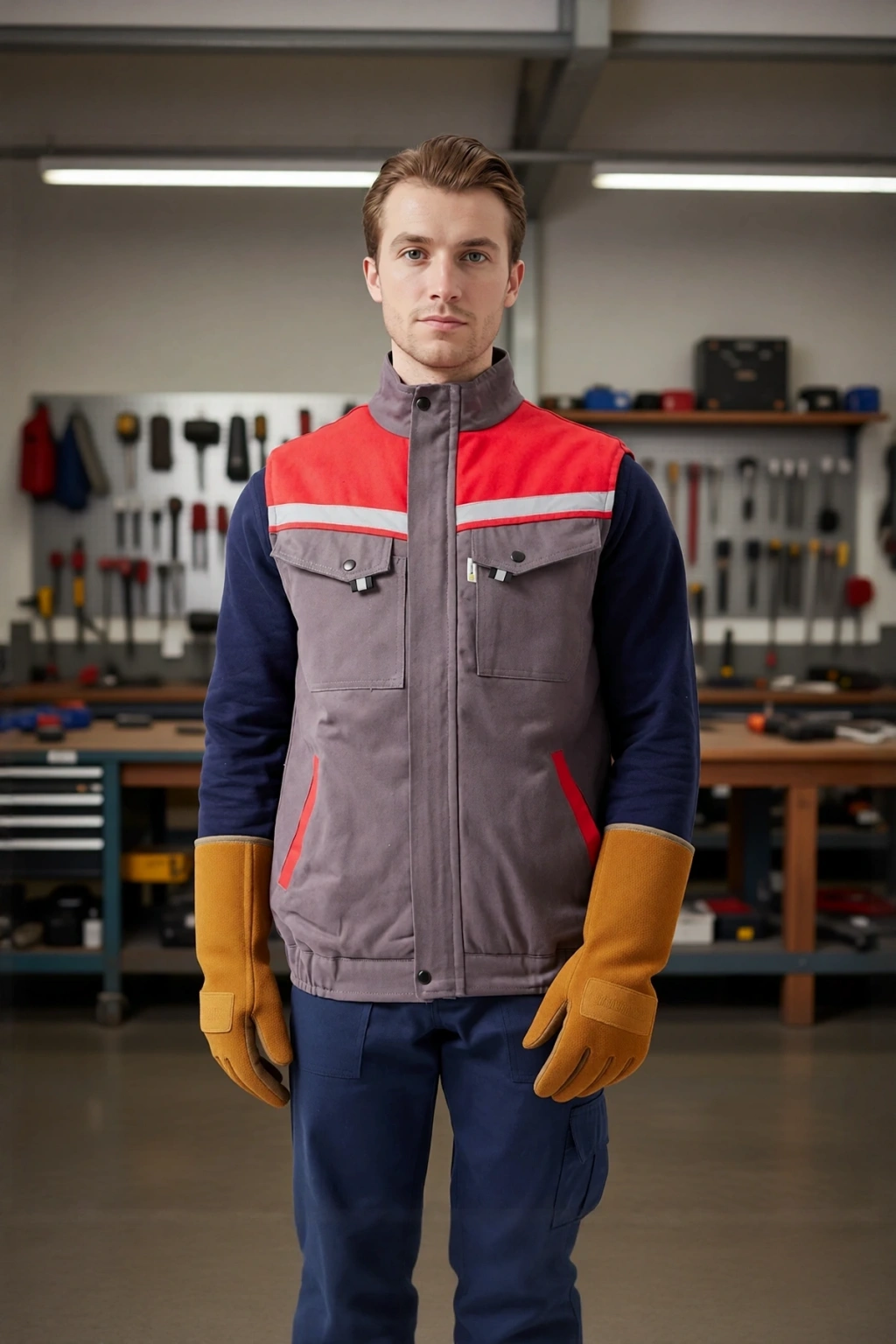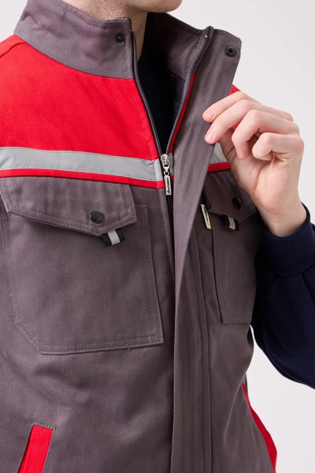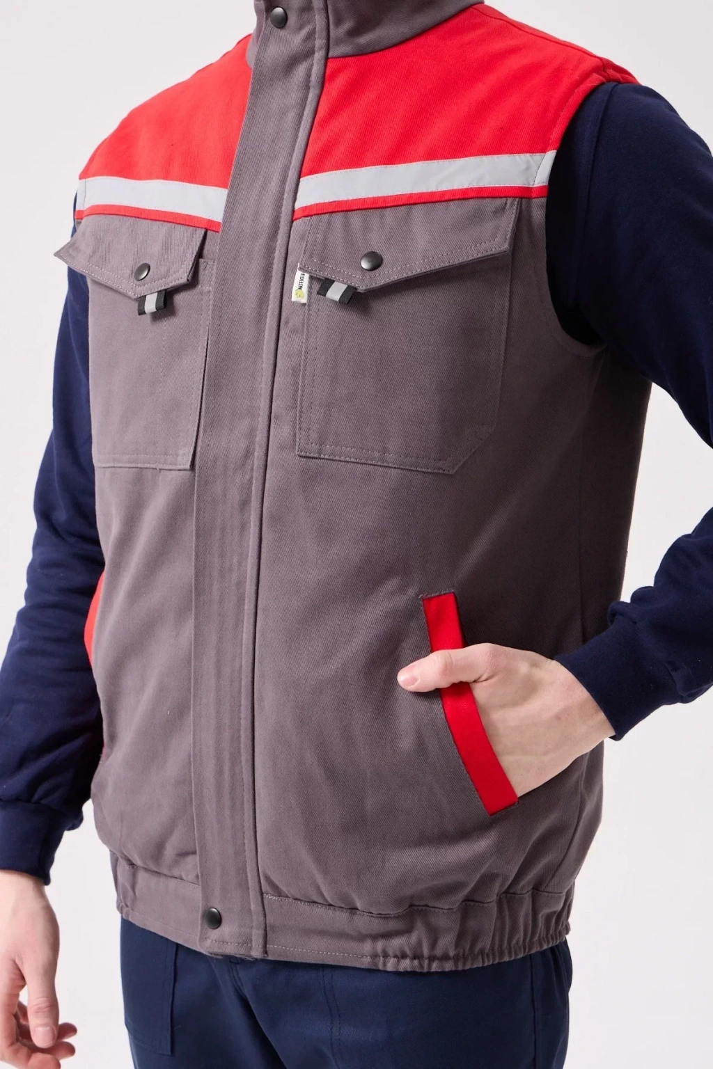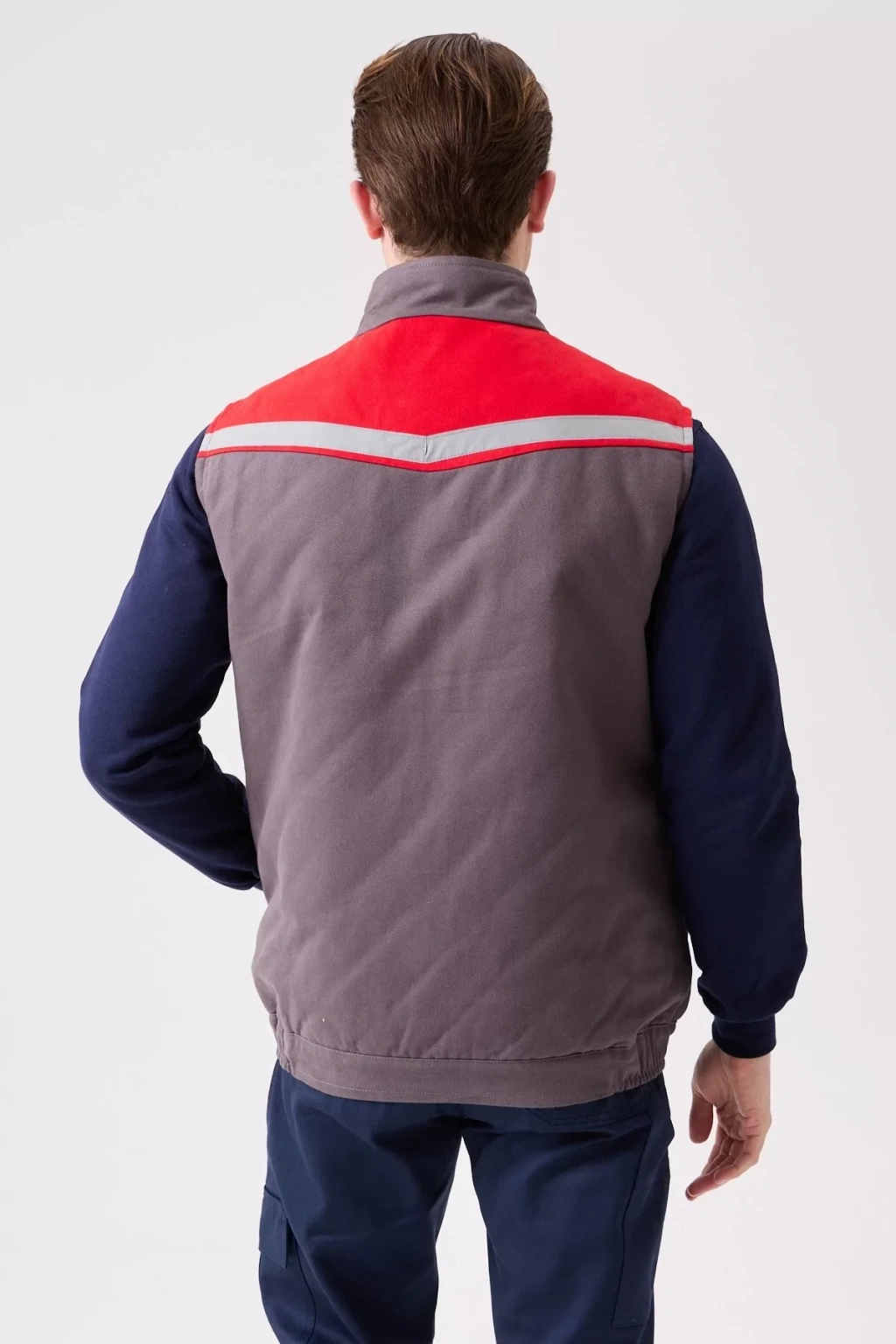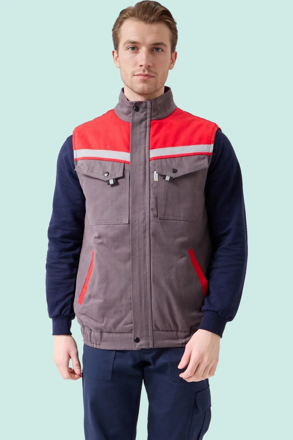 Kışlık İş Yeleği GriKırmızı Gabardin Çok Cepli Royal Sıcak Tutucu Rüzgar Geçirmez Reflektörlü