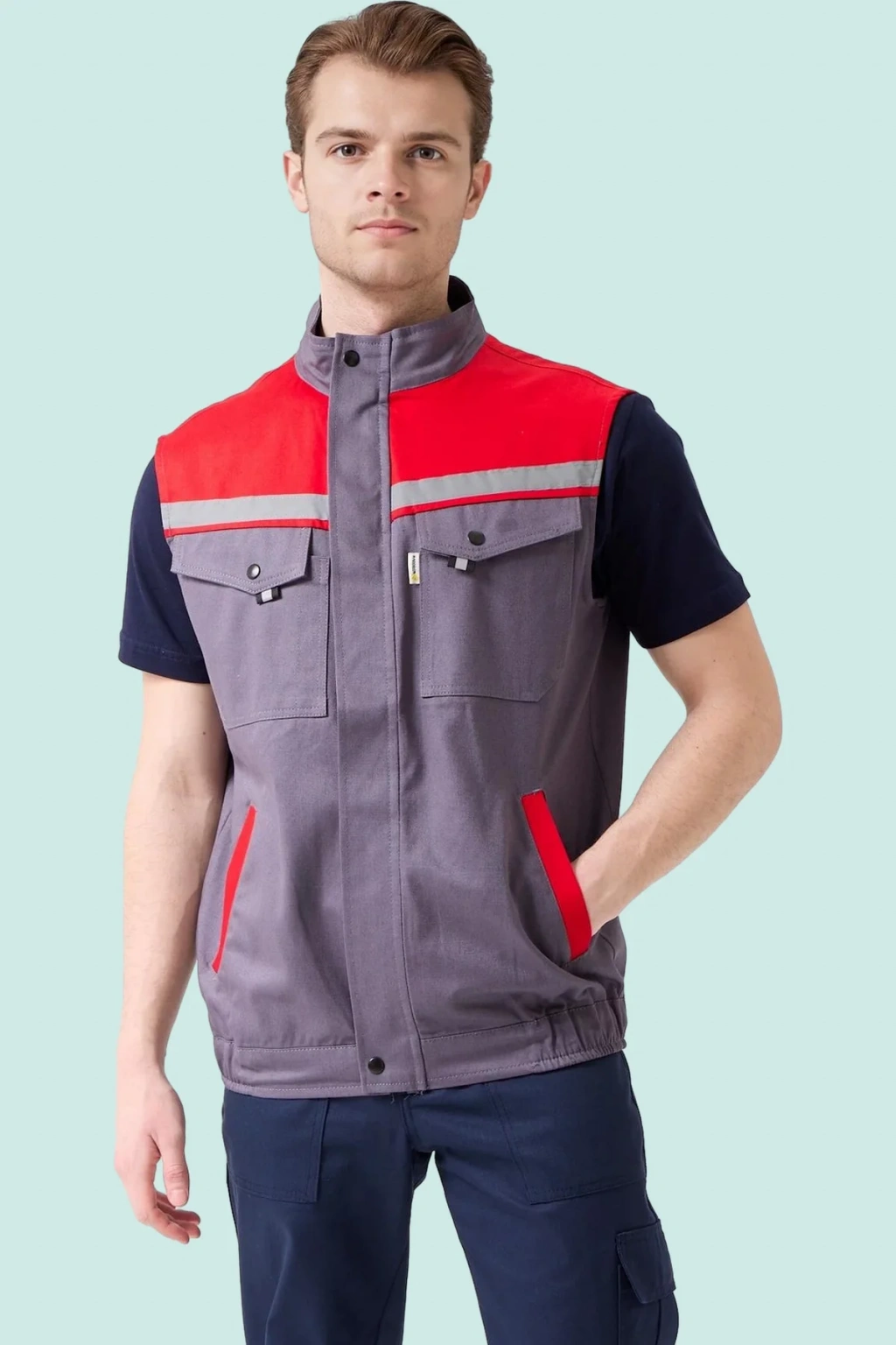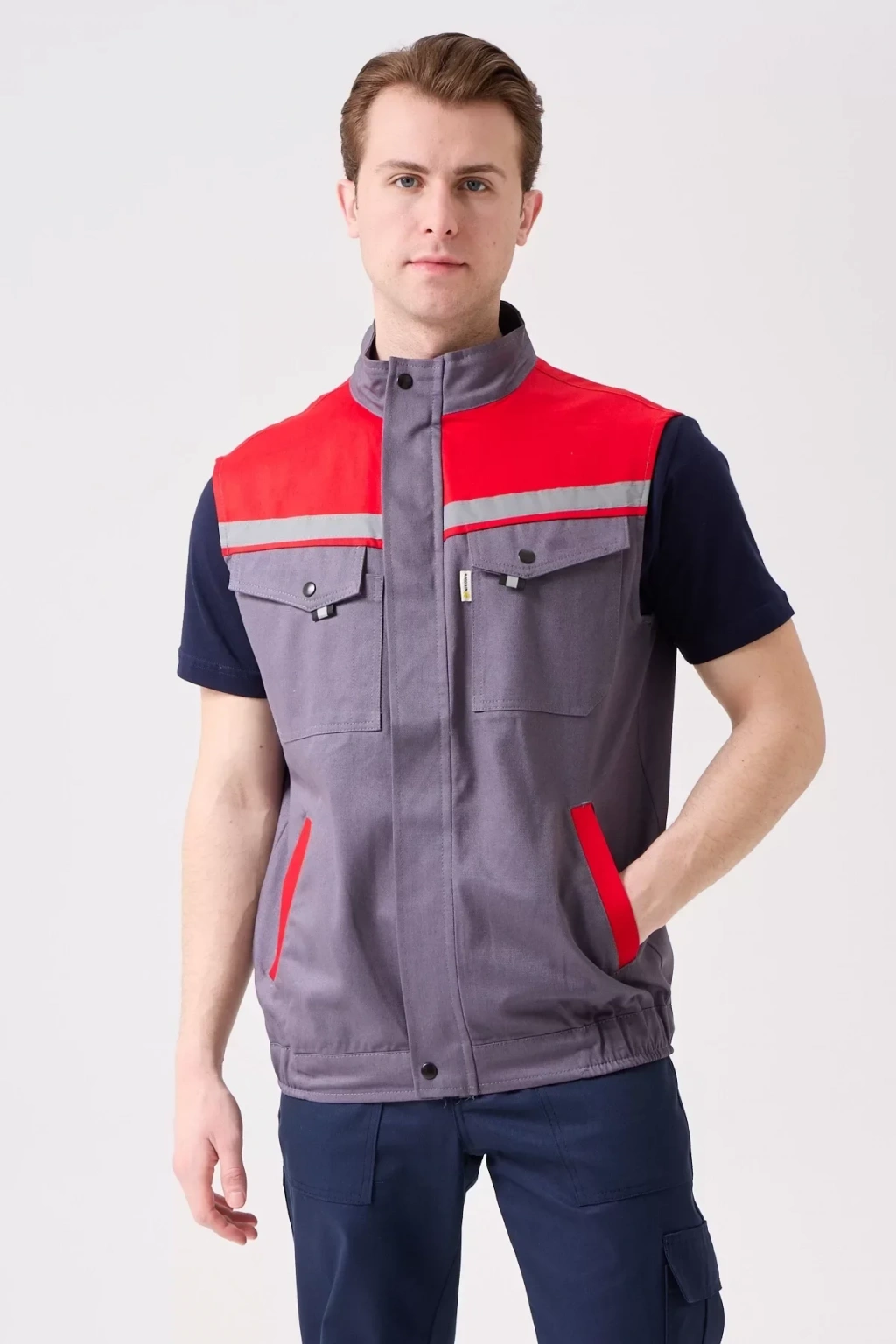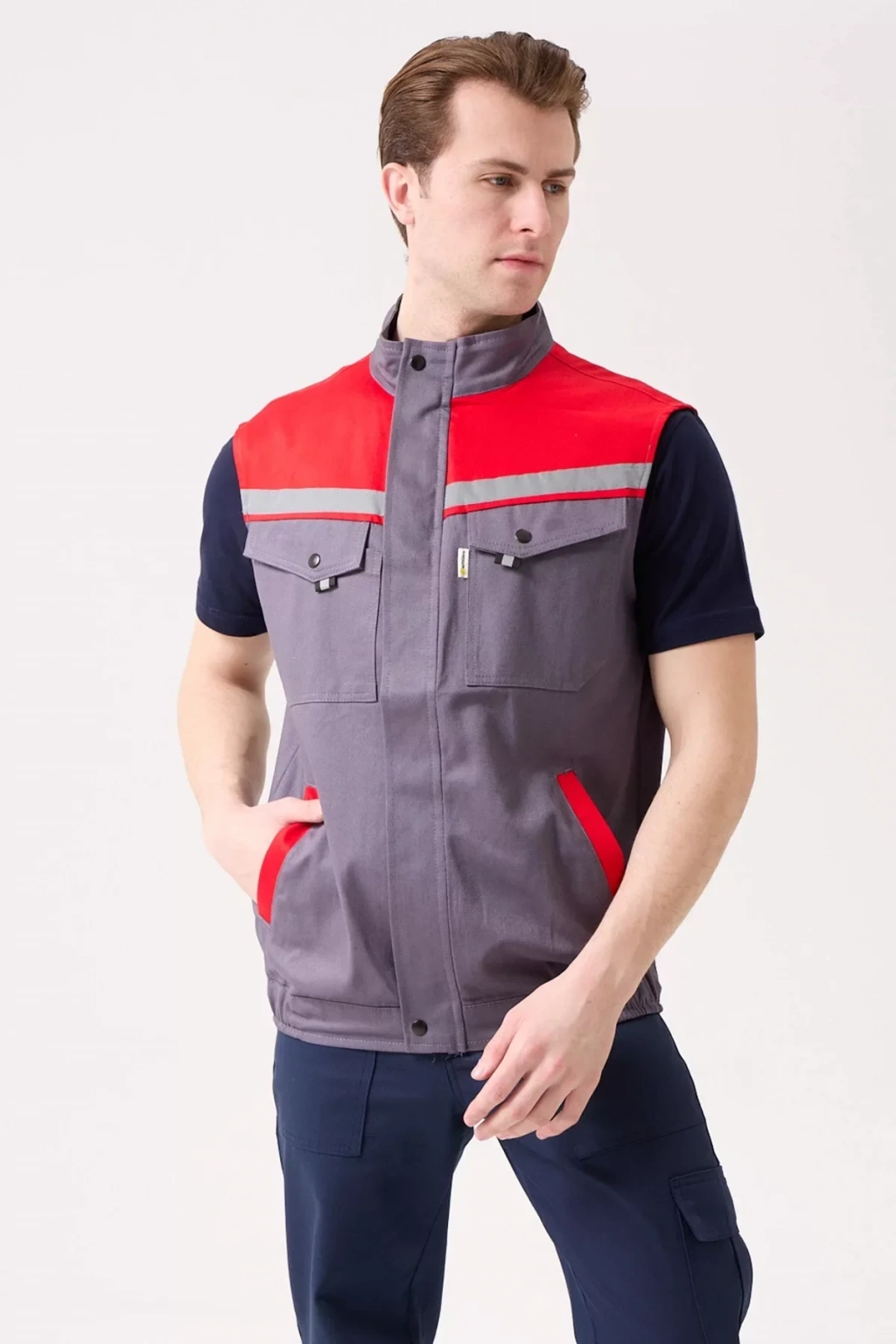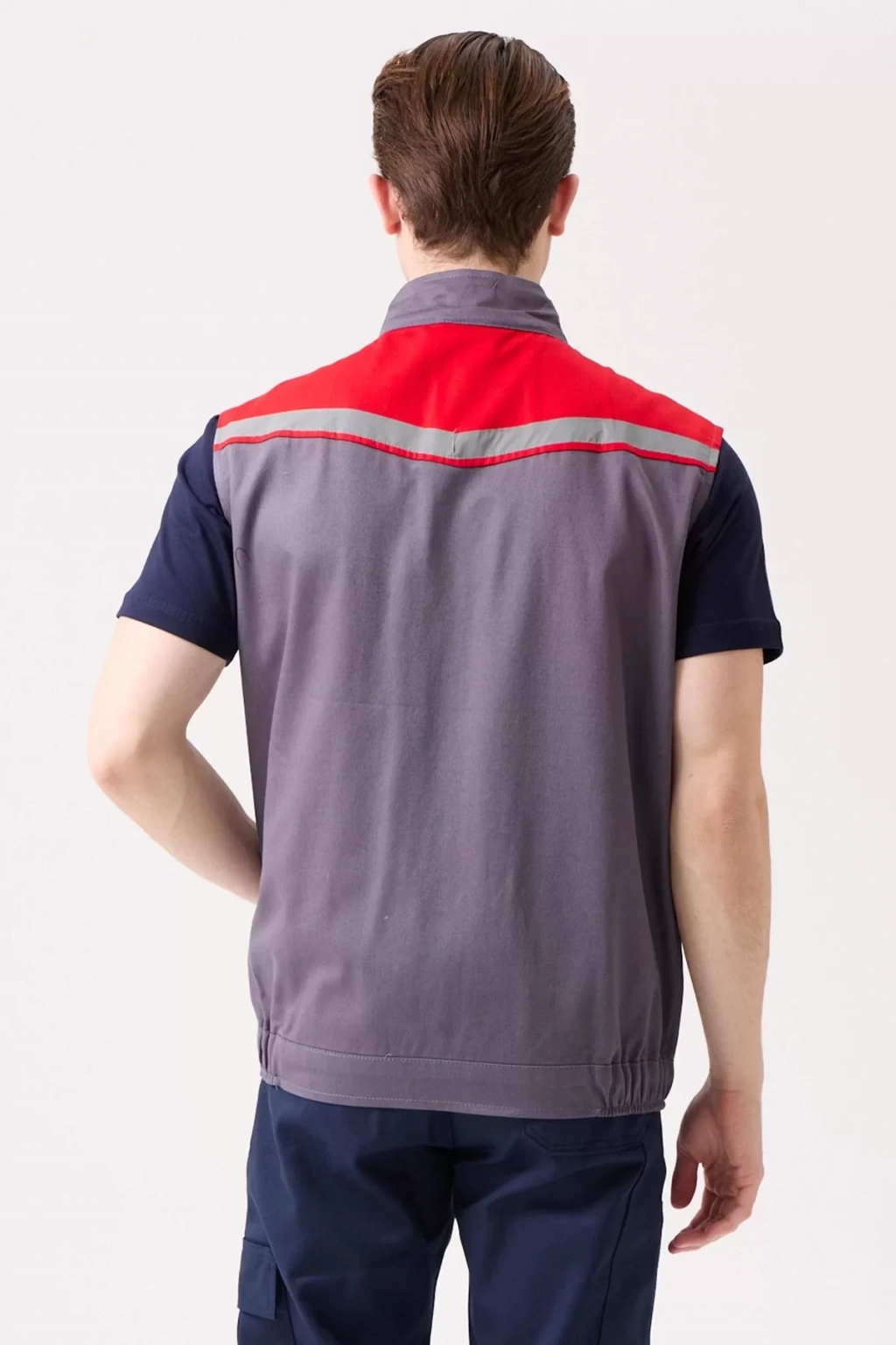 Yaz aylarında iş güvenliği ve konforu bir arada sunan Gabardin kumaştan üretilmiş gri ve kırmızı renkli iş yeleği. Nefes alabilir yapısıyla sıcak havalarda serin kalmanızı sağlar.