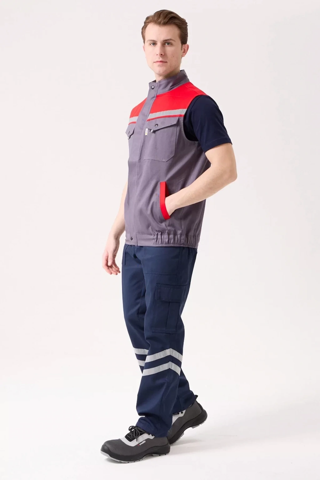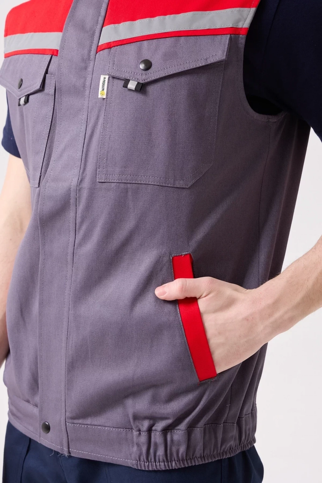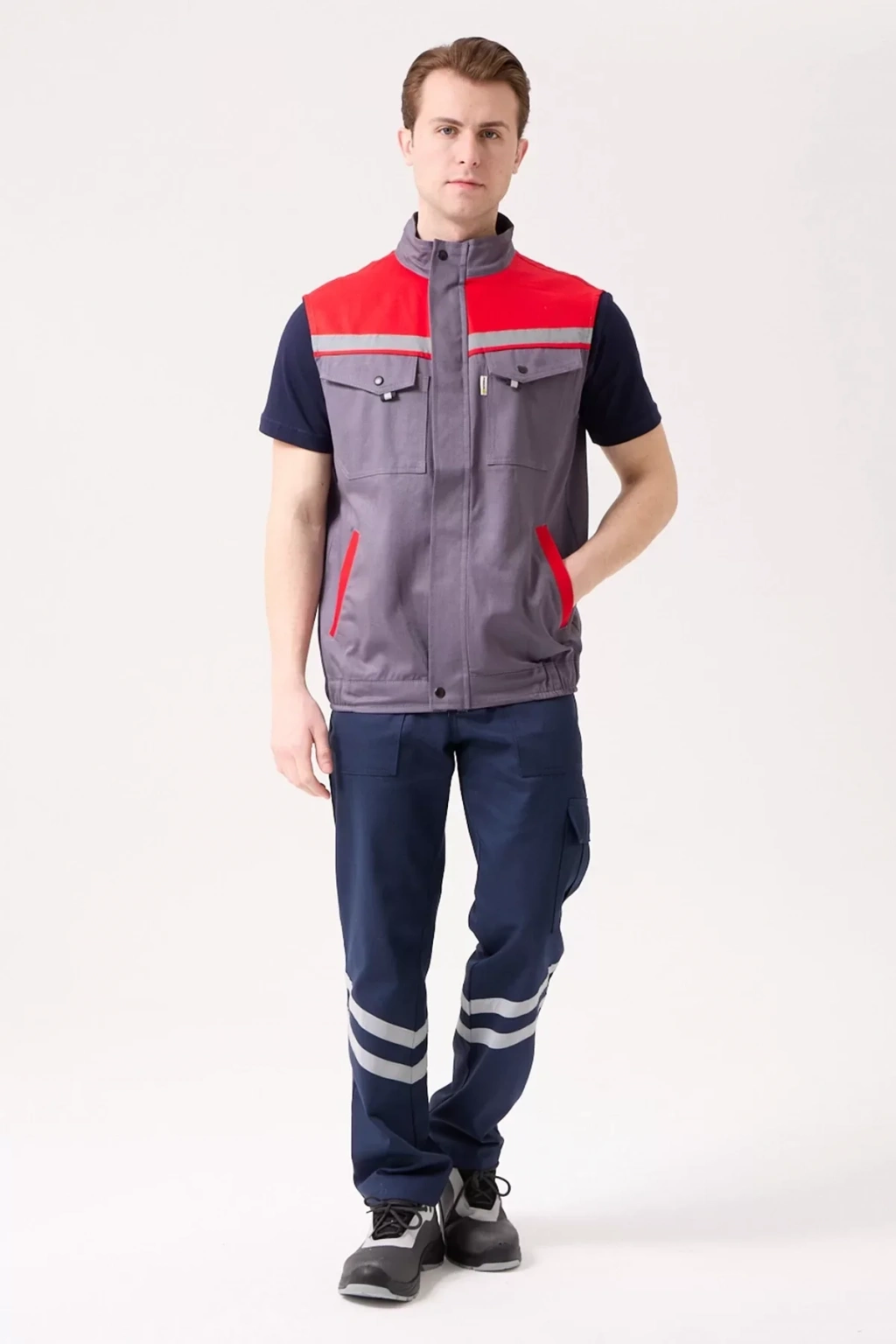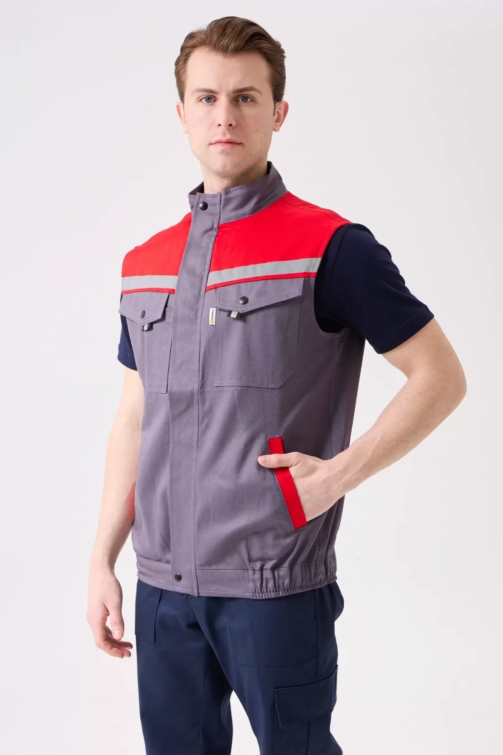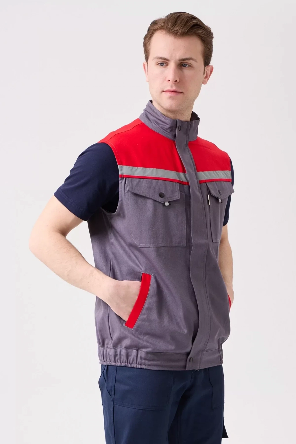 Yaz aylarında iş güvenliği ve konforu bir arada sunan Gabardin kumaştan üretilmiş gri ve kırmızı renkli iş yeleği. Nefes alabilir yapısıyla sıcak havalarda serin kalmanızı sağlar.