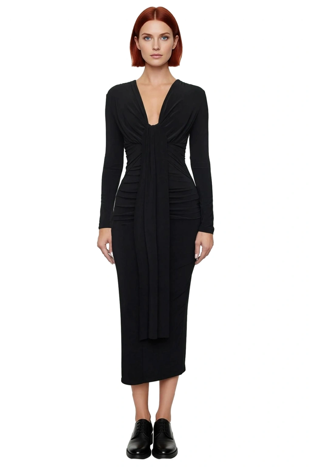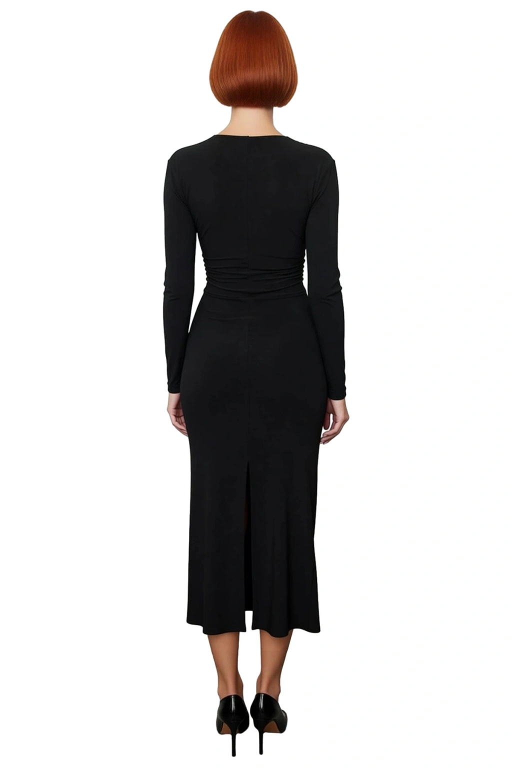 Bu bodycon kesim maxi elbise, tüm vücut tiplerine uyum sağlayarak kusursuz bir görünüm yaratır. Kokteyl koleksiyonu için ideal olan bu parçayı, topuklu ayakkabılar ve minimal takılarla tamamlayarak şık gece ortamlarında ve özel davetlerde göz alıcı bir stil sergileyebilirsiniz. Kış sezonunun soğuk günlerinde bile zarafetinizden ödün vermeden şıklığınızı ön plana çıkarır.