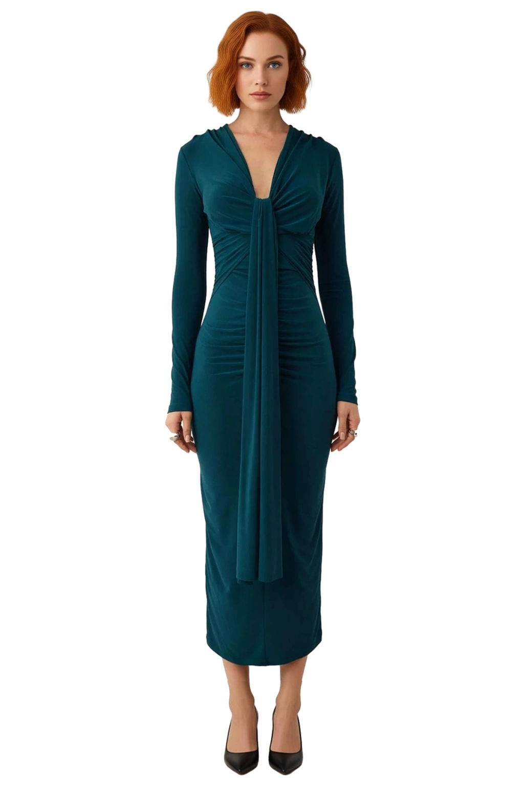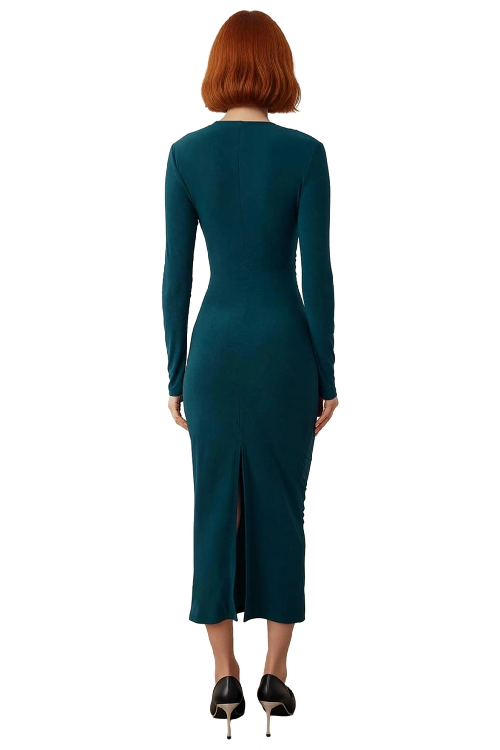 Ürün Özellikleri: Bodycon kalıp, %96 polyester %4 elastan materyal, düz desen, V yaka, standart kol, örme kumaş, yeşil renk, büzgü / drape detay.
