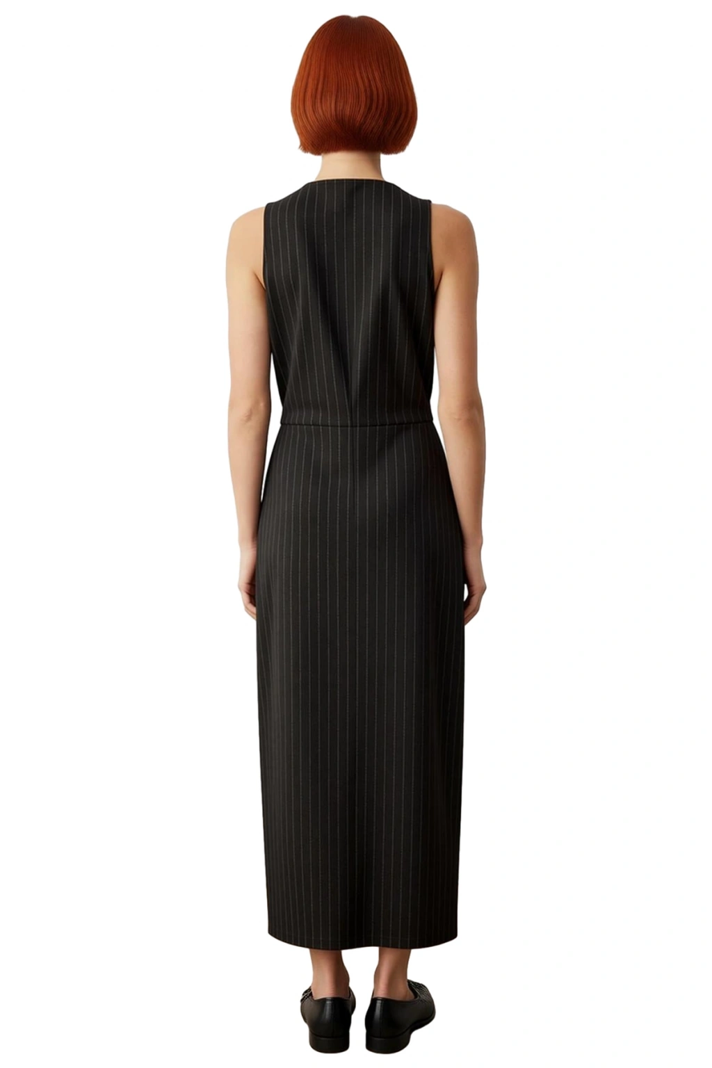Ürün Özellikleri: Bodycon kalıp, polyester viskoz elastan materyal, çizgili desen, V yaka, kolsuz, örme kumaş, siyah renk, düğmeli tasarım.