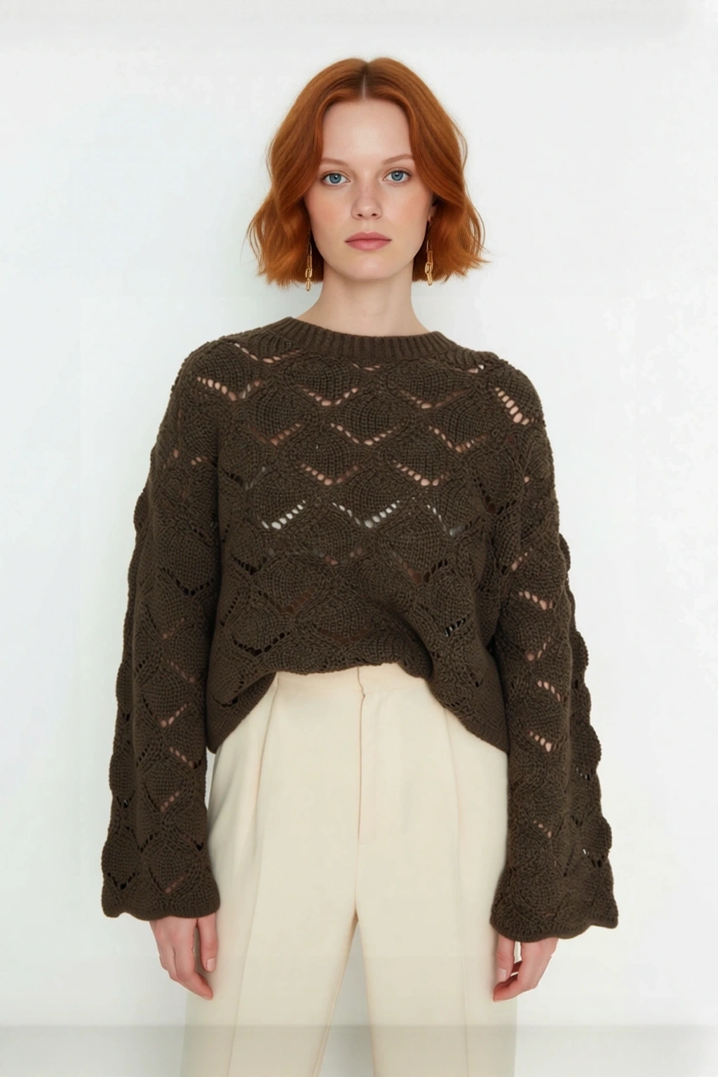 Ürün Özellikleri: Oversize kalıp, akrilik materyal, ajurlu desen, bisiklet yaka, İspanyol kol, triko kumaş, ekru renk.