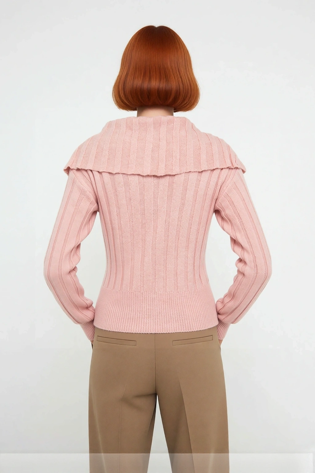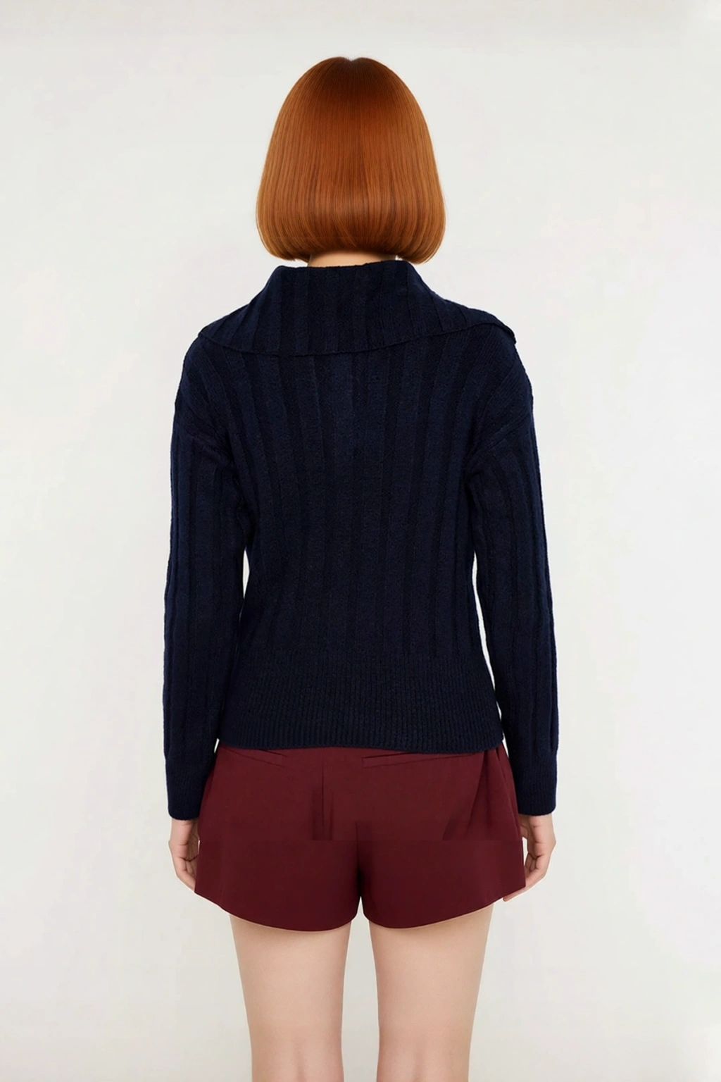 Ürün Özellikleri: Regular kalıp, triko materyal, düz desen, devrik yaka, düşük kol, orta kalınlık, crop boy, tek plaka dokuma, lacivert renk, uzun kol boyu, casual/günlük ortam.
