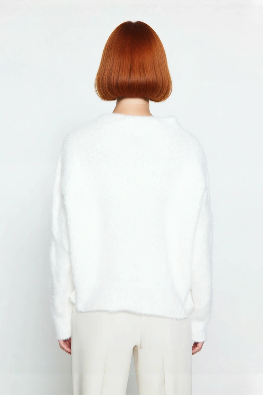 Ürün Özellikleri: Oversize kalıp, polyester karışımlı materyal, düz desen, dik yaka, standart kol, triko kumaş, ekru renk.