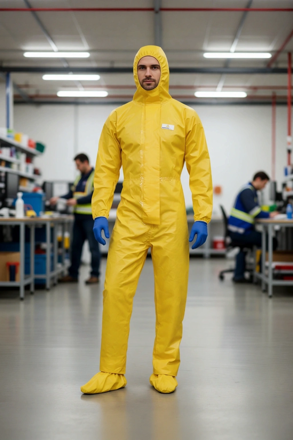 • Özellikler: Kimyasal dayanıklı, su geçirmez, nefes alabilen, tam kapsamlı koruma (başlık, lastikli bilek, ayak kısmı), ergonomik tasarım