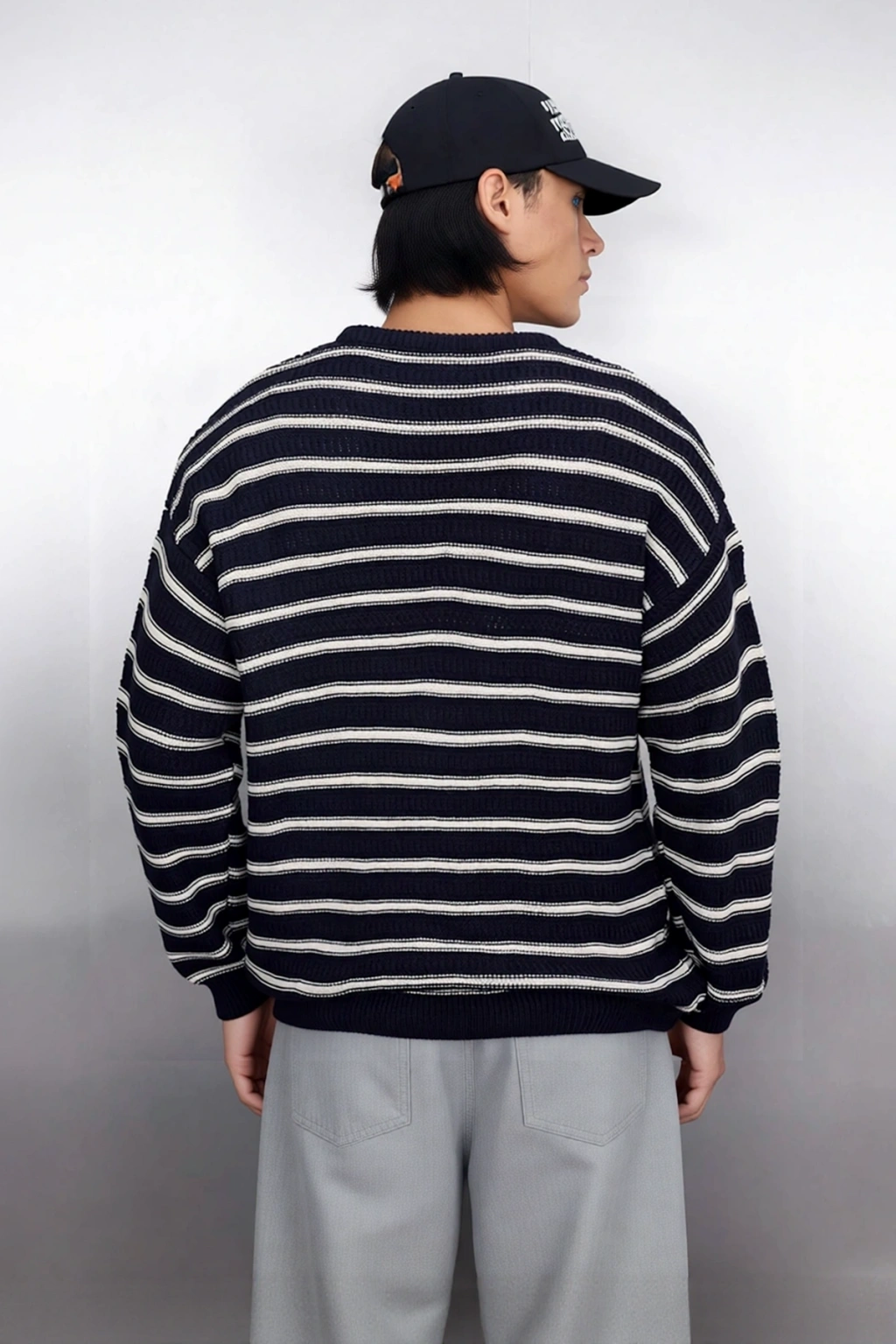 Ürün Özellikleri: Oversize kalıp, akrilik materyal, çizgili desen, bisiklet yaka, standart kol, triko kumaş, bej renk, cepsiz tasarım.