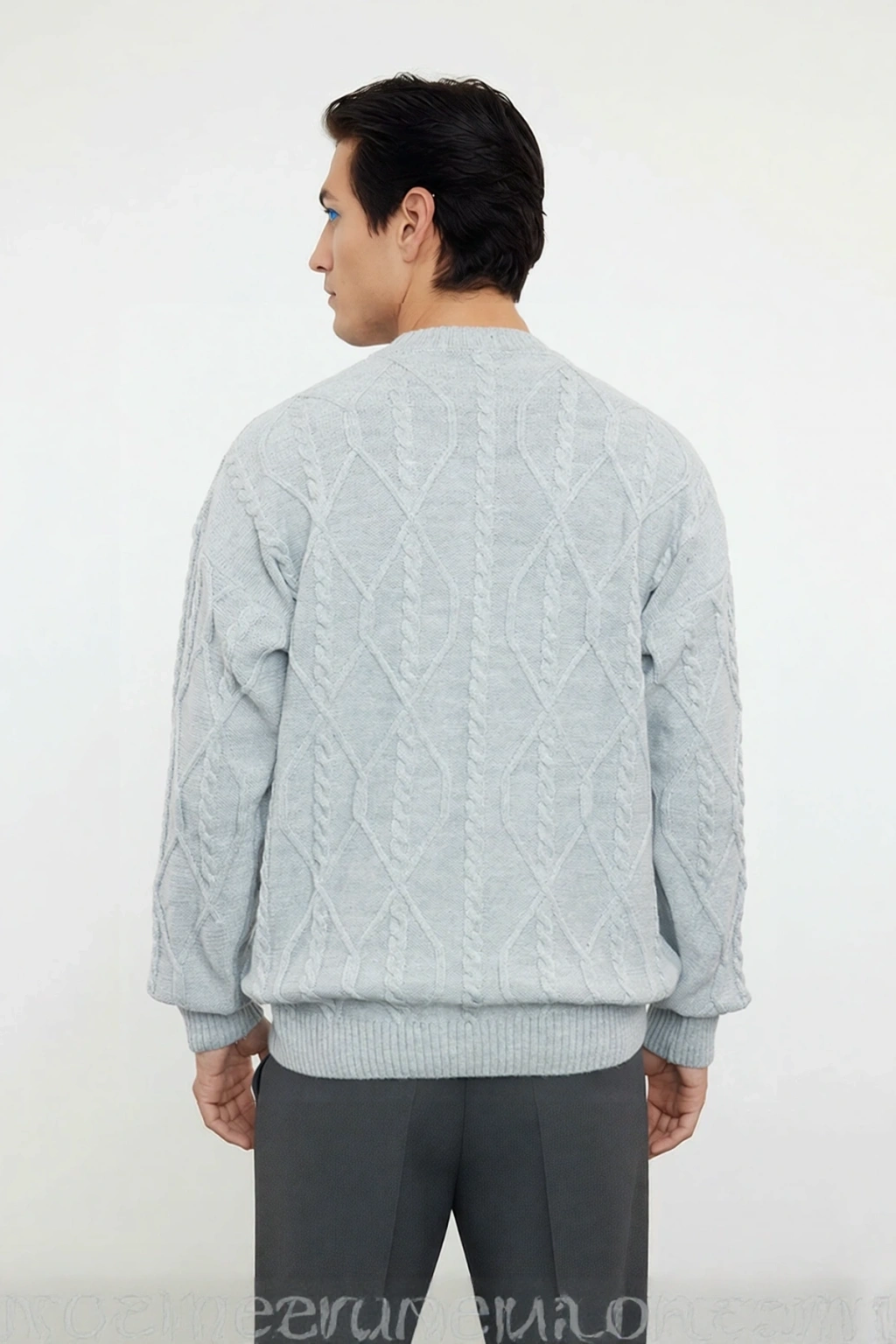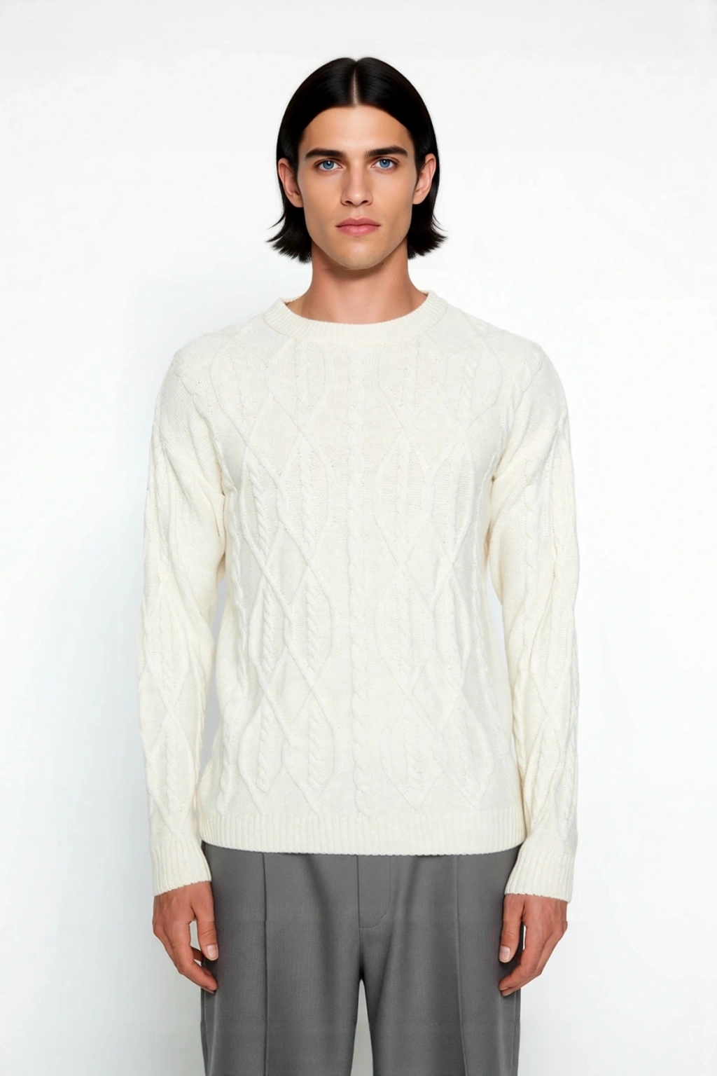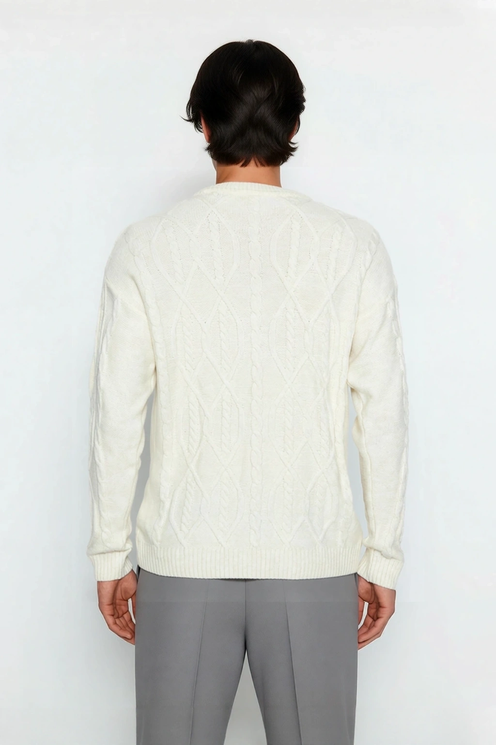 Ürün Özellikleri: Oversize kalıp, akrilik karışımlı materyal, saç örgü desen, bisiklet yaka, standart kol, triko kumaş, ekru renk, baskısız tasarım, cepsiz.