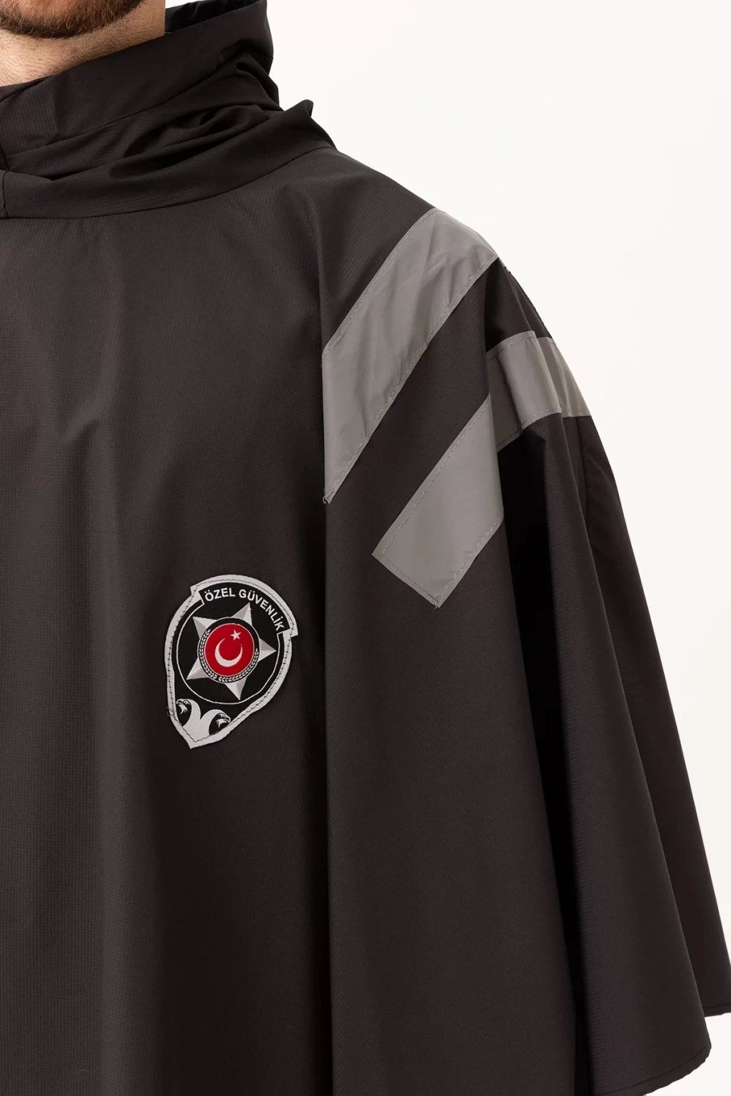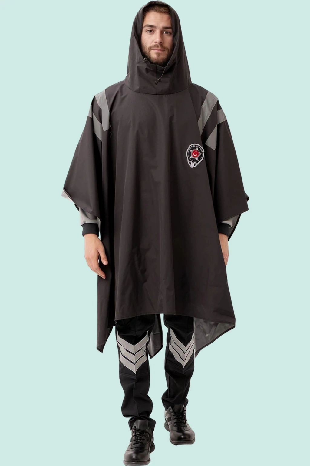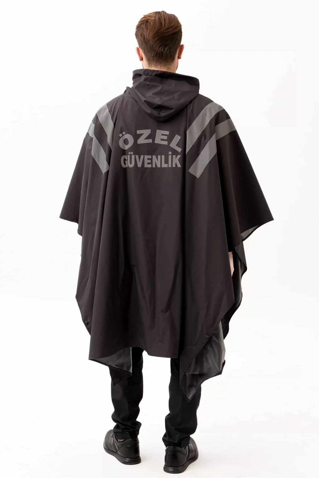 Yoğun yağışlı havalarda güvenliğinizi ve görünürlüğünüzü en üst düzeye çıkaran, siyah renkli, suya dayanıklı iş güvenliği yağmurluk panço.