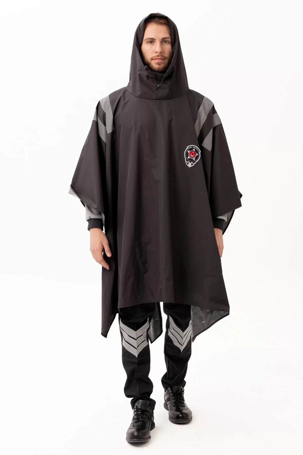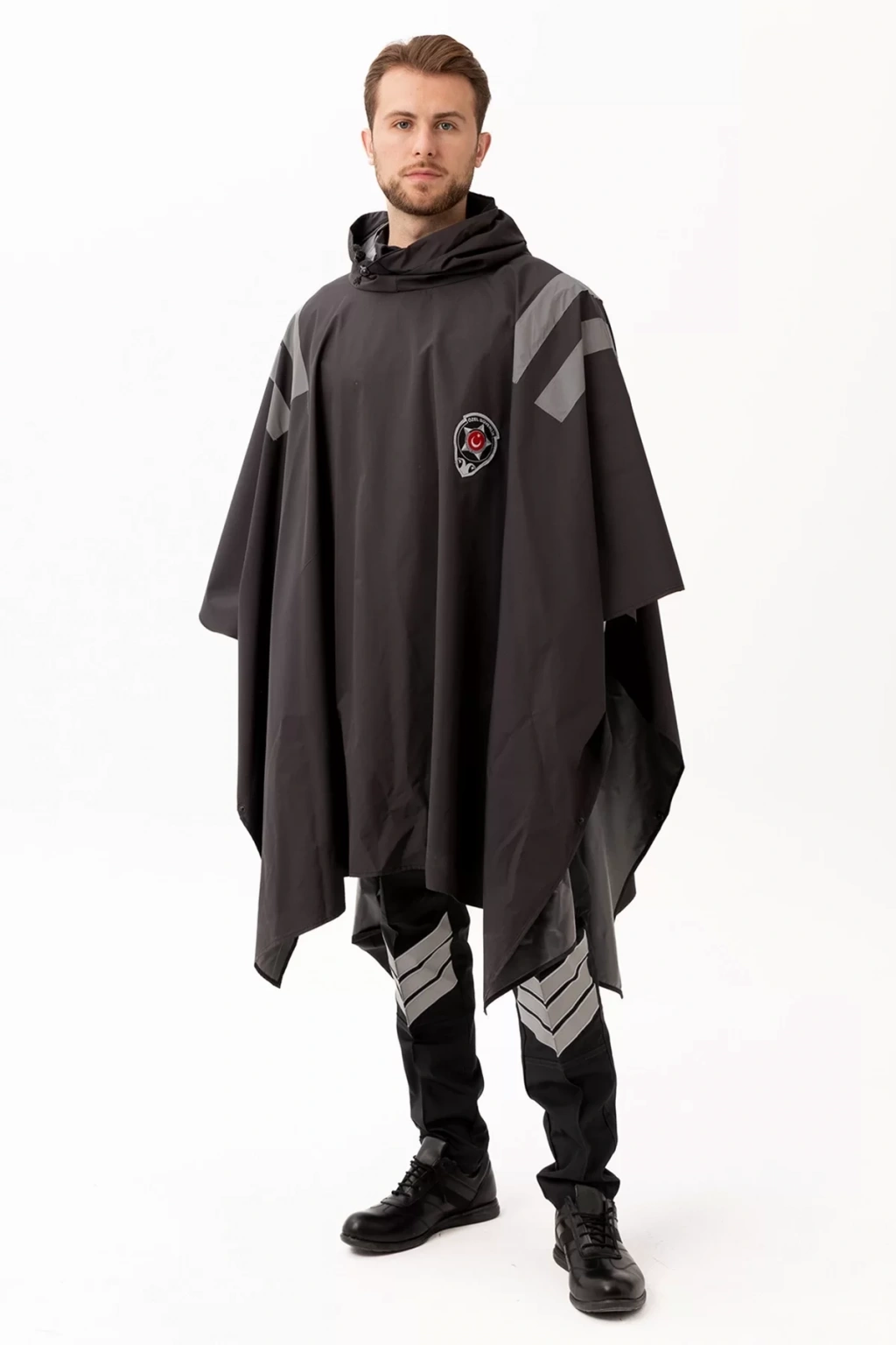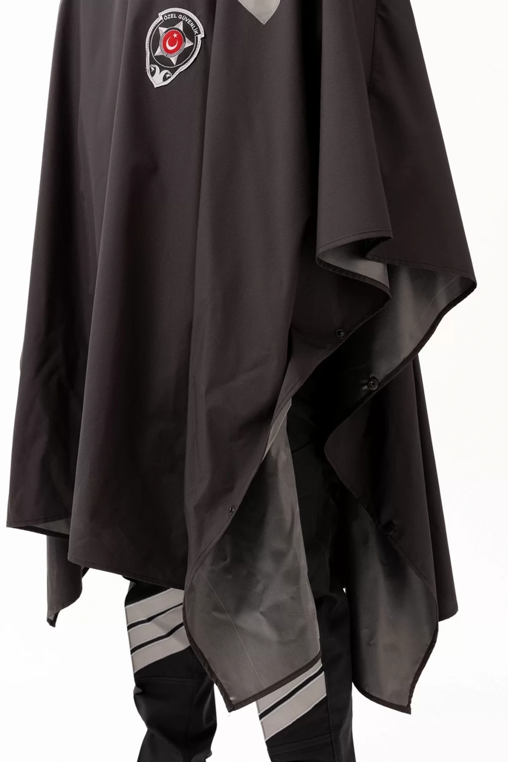 Yoğun yağışlı havalarda güvenliğinizi ve görünürlüğünüzü en üst düzeye çıkaran, siyah renkli, suya dayanıklı iş güvenliği yağmurluk panço.