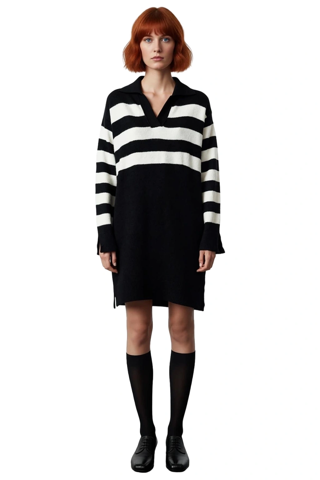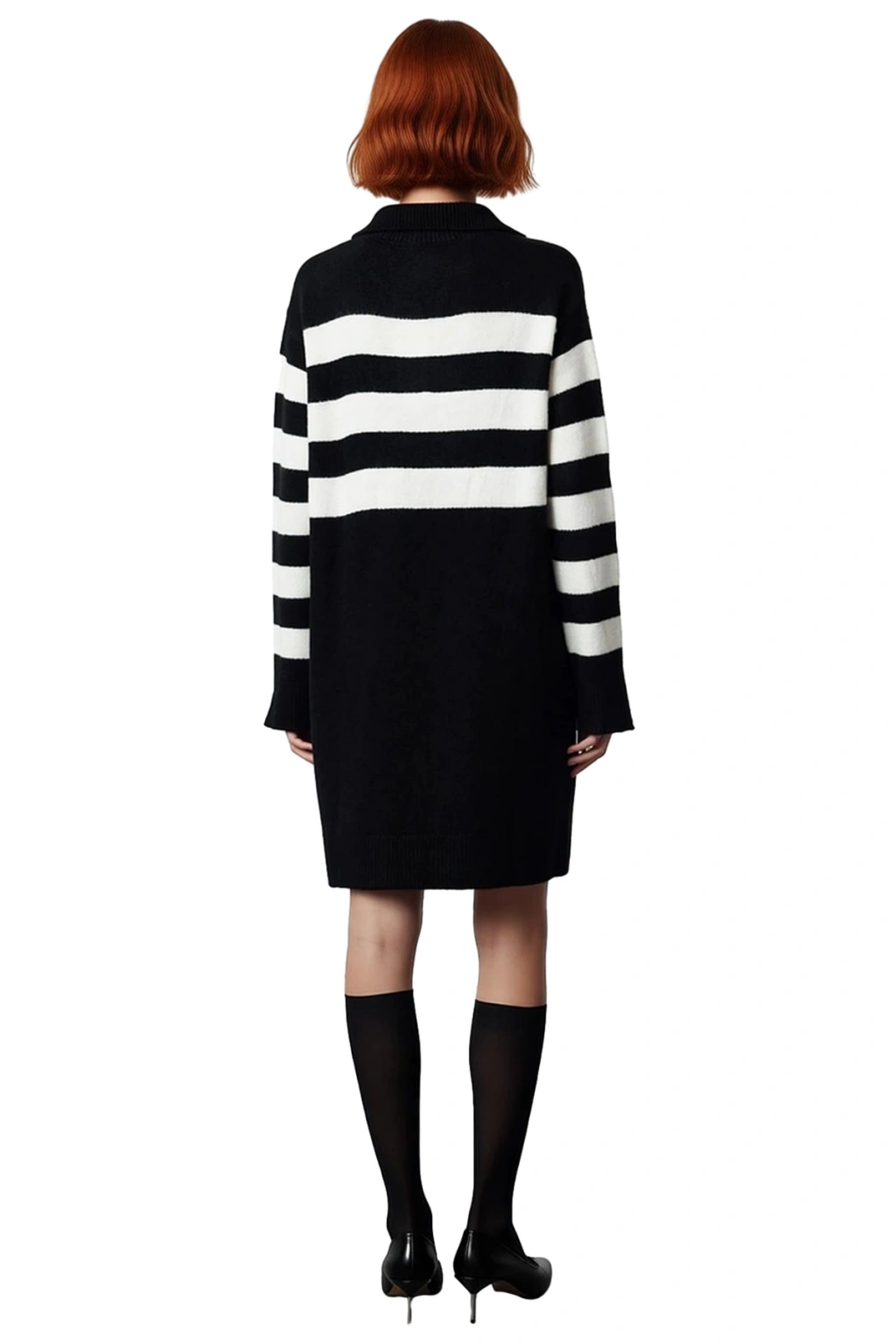 Ürün Özellikleri: Shift kalıp, akrilik materyal, çizgili desen, polo yaka, standart kol, triko kumaş, siyah renk, cepsiz, astarsız.
