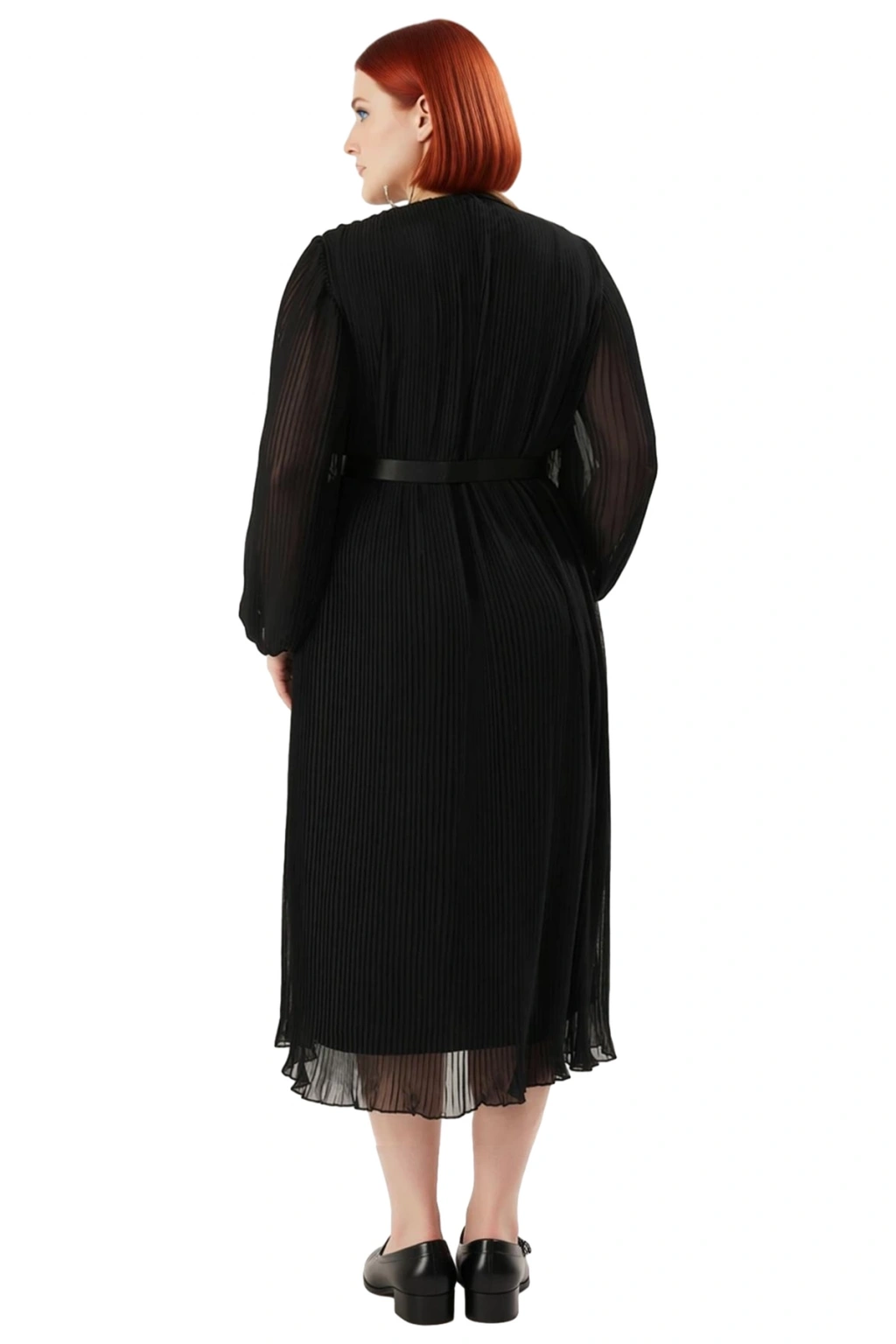 Elbisenin V yaka tasarımı, boyun bölgesini zarifçe ortaya çıkarırken, uzun standart kolları soğuk havalarda sıcak tutar ve şık bir görünüm sunar. Şifon dokuma kumaşın hafif ve nefes alabilen yapısı, özellikle ilkbahar ve sonbahar aylarında ideal bir tercih olmasını sağlar. Piliseli dokusu, dinamik bir estetik sunarken aynı zamanda kırışıklıklara karşı direnç gösterir. Kemer, belinizi vurgulayarak daha orantılı bir görünüm elde etmenize yardımcı olur. Kolay ütülenebilen ve makinede yıkanabilir özelliği sayesinde bakımı oldukça pratiktir.