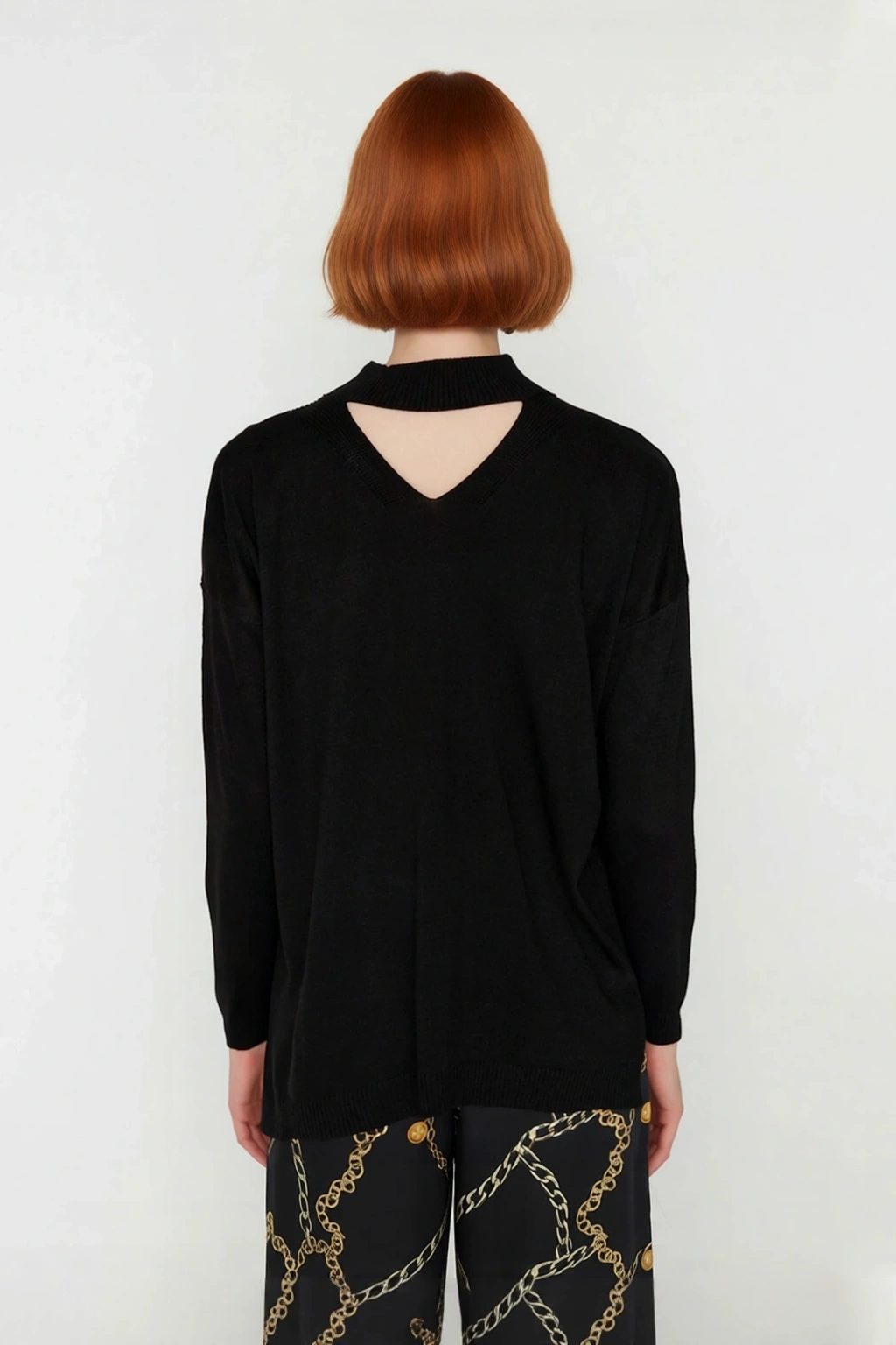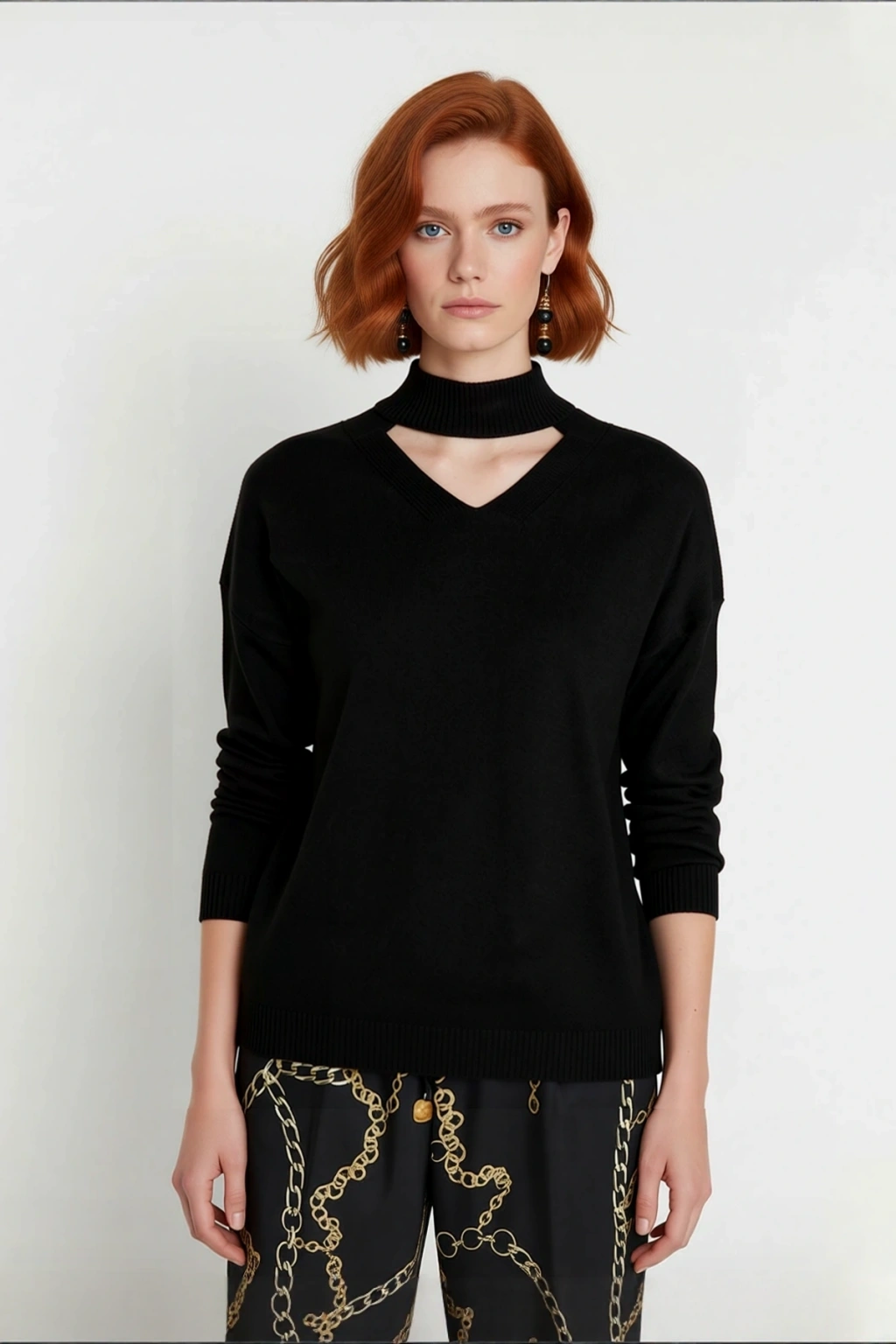 Ürün Özellikleri: Regular kalıp, akrilik materyal, düz desen, choker yaka, uzun kol, triko kumaş, siyah renk, baskısız tasarım.