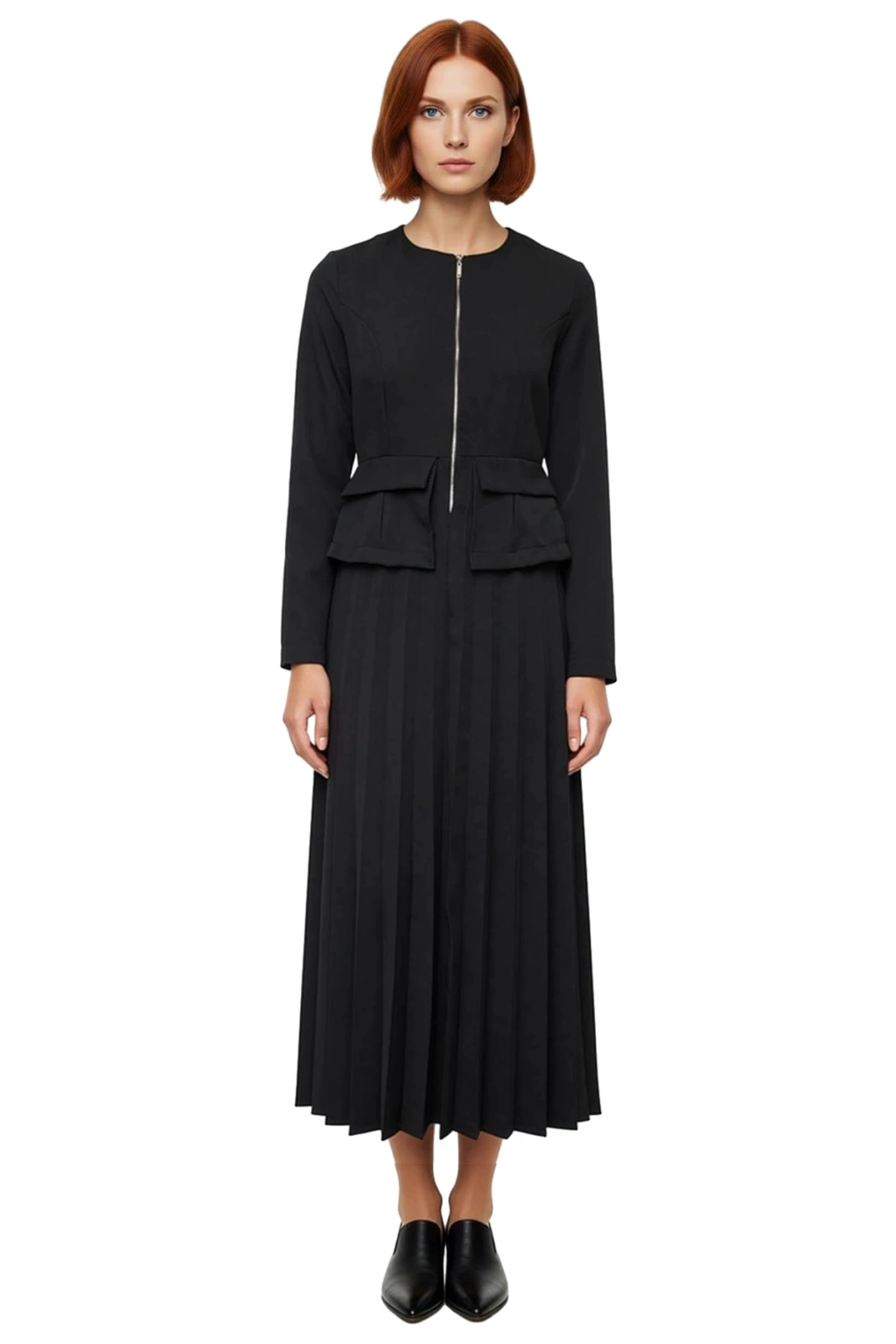 Bisiklet yaka tasarımı, bu elbiseye sofistike bir dokunuş katarken, standart uzun kol yapısı resmiyet ve zarafeti tamamlar. Elbisenin ön kısmında yer alan modern fermuar detayı, ürüne çağdaş bir hava katar ve giyip çıkarmayı kolaylaştırarak pratik bir kullanım sunar. Finike dokuma tekniğiyle özenle üretilen bu elbise, astarsız olmasına rağmen kaliteli kumaş yapısıyla iç göstermez ve vücuda hoş bir dokunuş sunar. Üst bölümdeki kapaklı cep görünümlü detaylar, tasarıma özgün bir karakter ve görsel zenginlik katarak sıradanlıktan uzaklaşmasını ve stilinize kişisel bir dokunuş eklemesini sağlar.